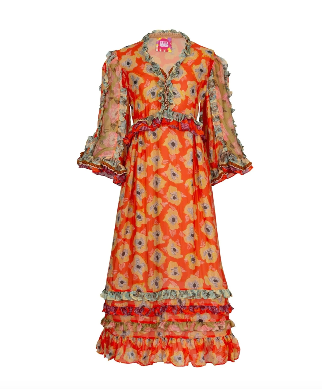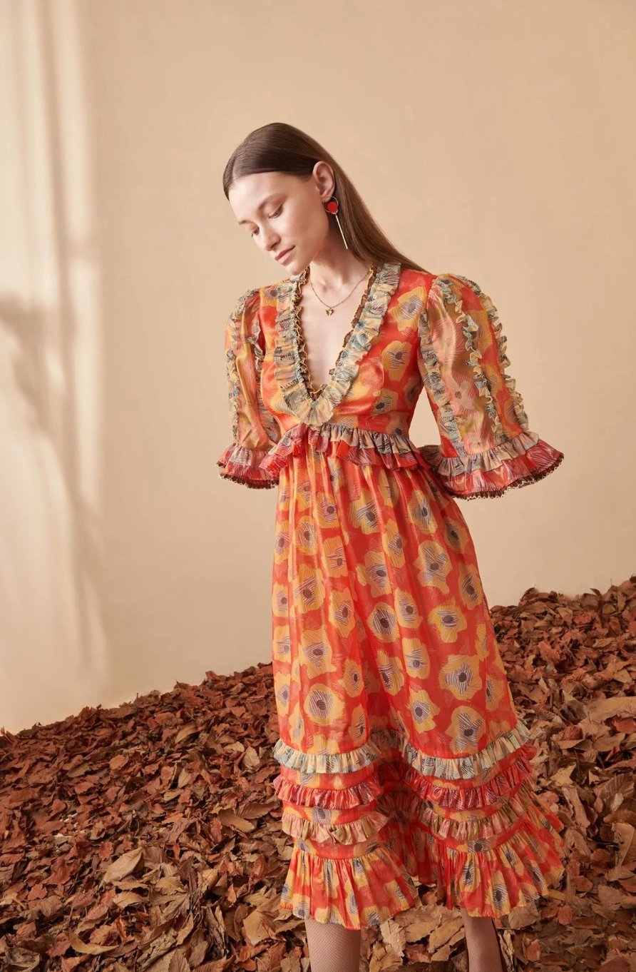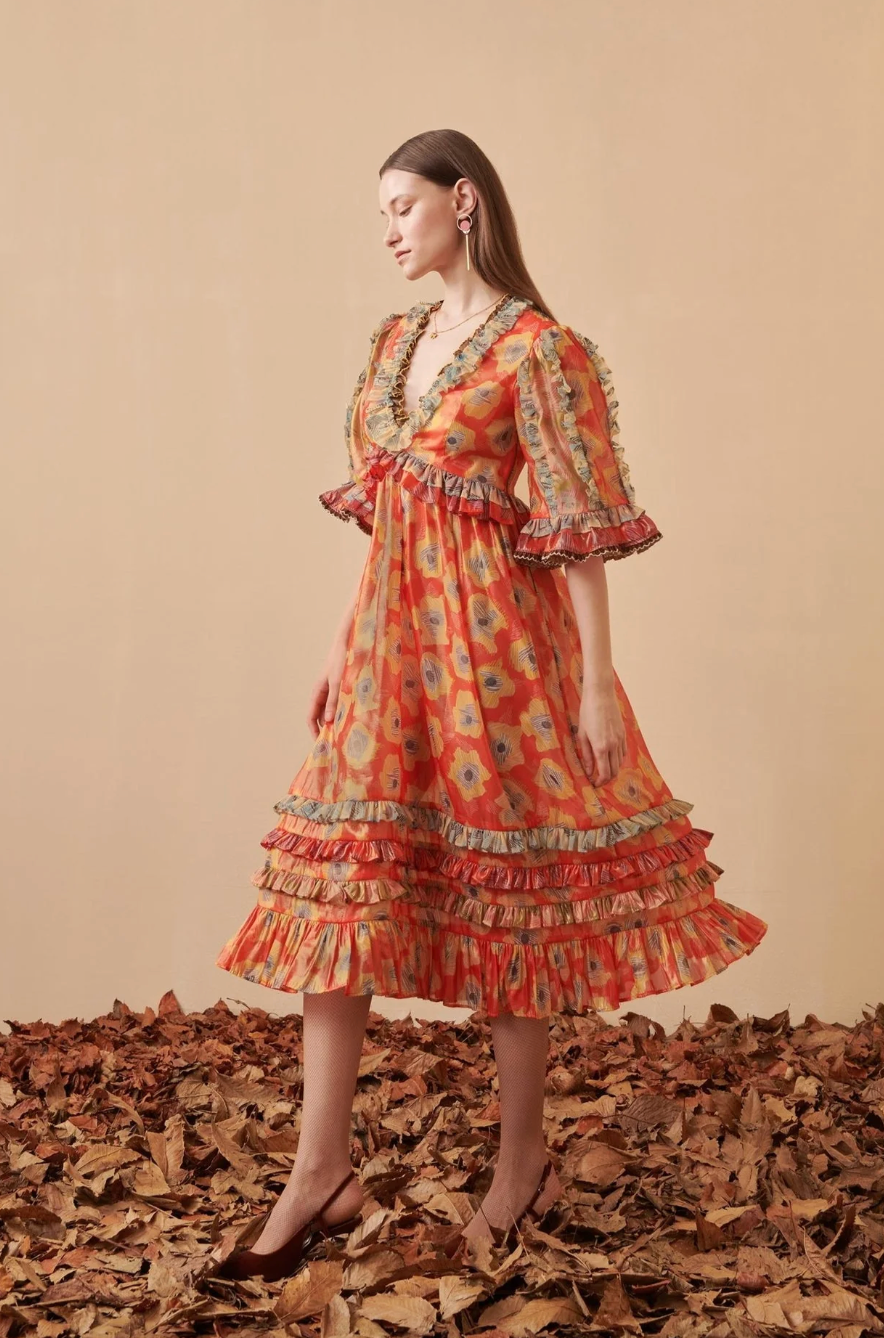 Bold, romantic, and full of movement. The Aura Midi Dress features a vibrant floral print, ruffled trims, sheer puff sleeves, and a tiered skirt for a stunning statement look.