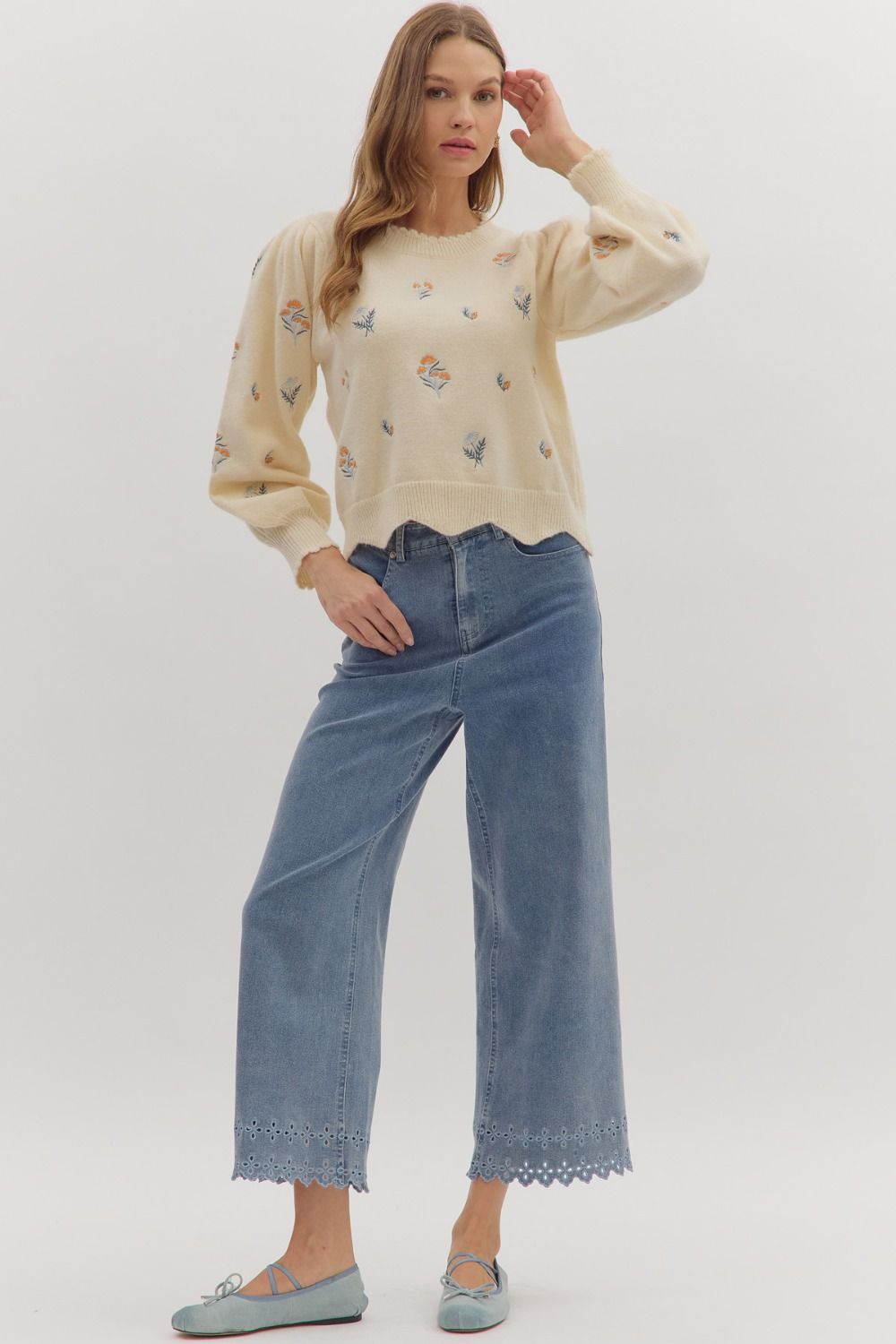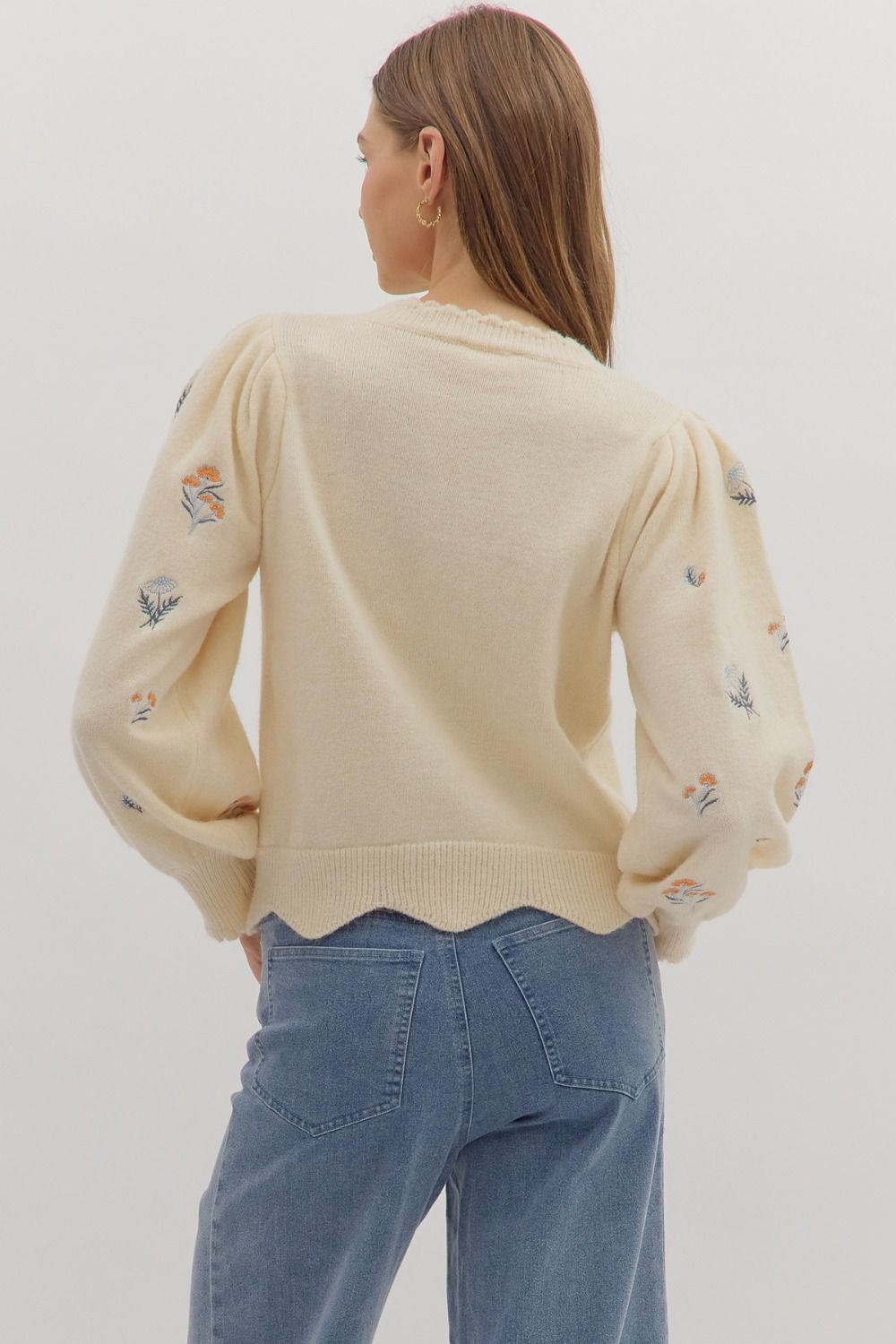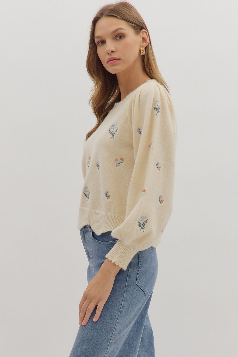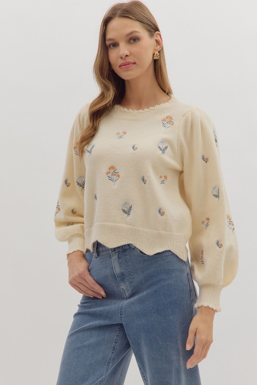 Sweet and cozy, this cream sweater features delicate floral embroidery, puff sleeves, and a scalloped hem for a feminine finish.