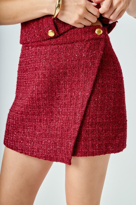 ENDLESS ROSE VIVIENNE TWEED FAUX WRAP SKIRT IN MERLOT