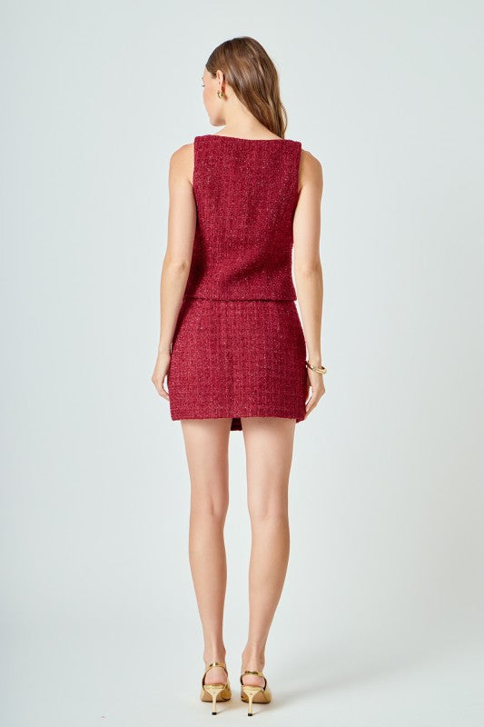 Chic and timeless, the Vivienne Tweed Mini Skirt adds a touch of sophistication to any look. Crafted in rich merlot tweed, this faux-wrap design features subtle shimmer and gold button detailing at the waist. Pair it with the matching Vivienne Top for a polished set perfect for the season.