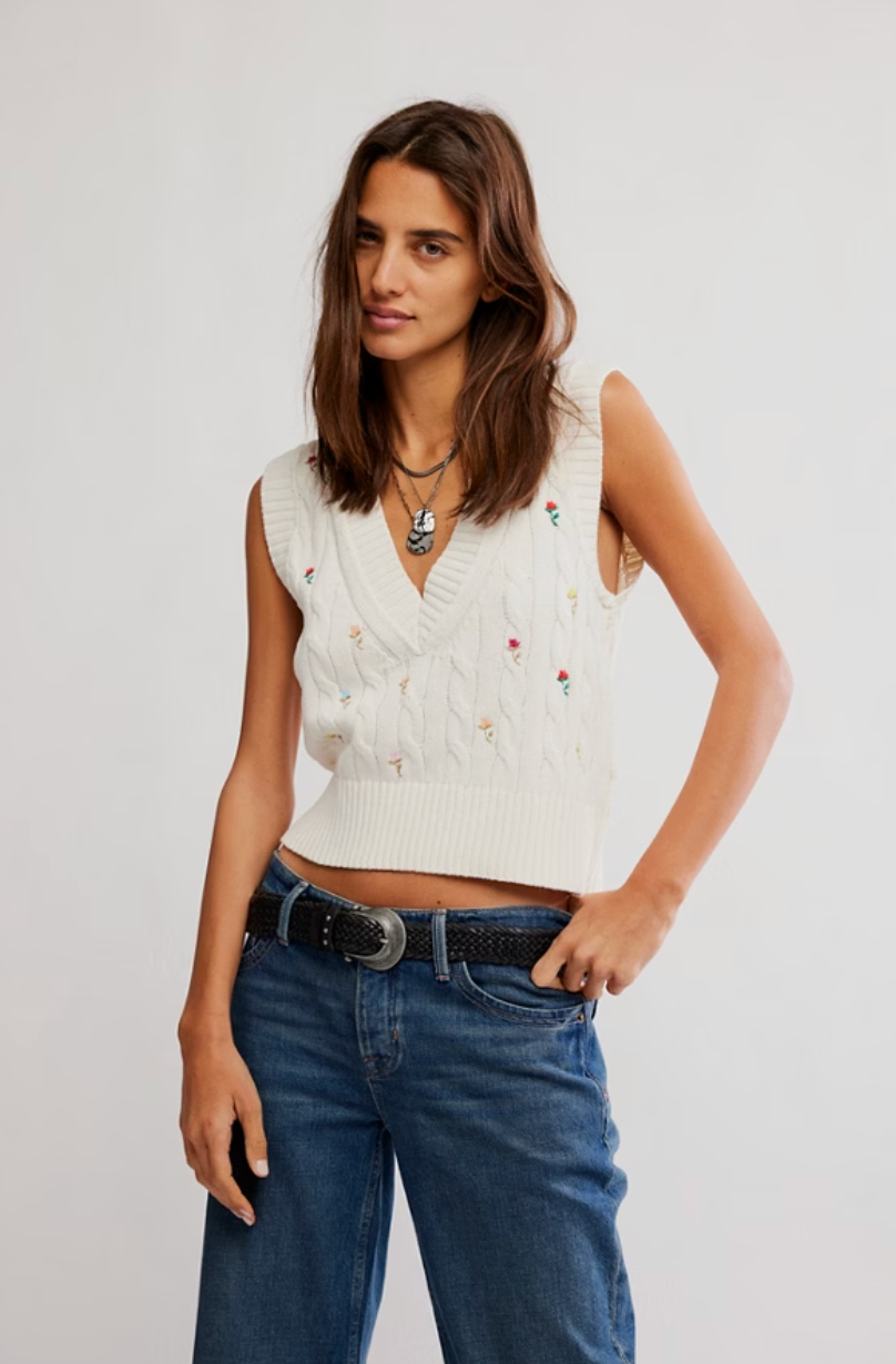 Sweet and classic, the Plumeria Floral V-Neck Vest by Free People features soft cable knit detailing with delicate floral embroidery throughout. Its cropped silhouette and deep V-neckline give a modern twist to a timeless design — perfect for layering or wearing solo.