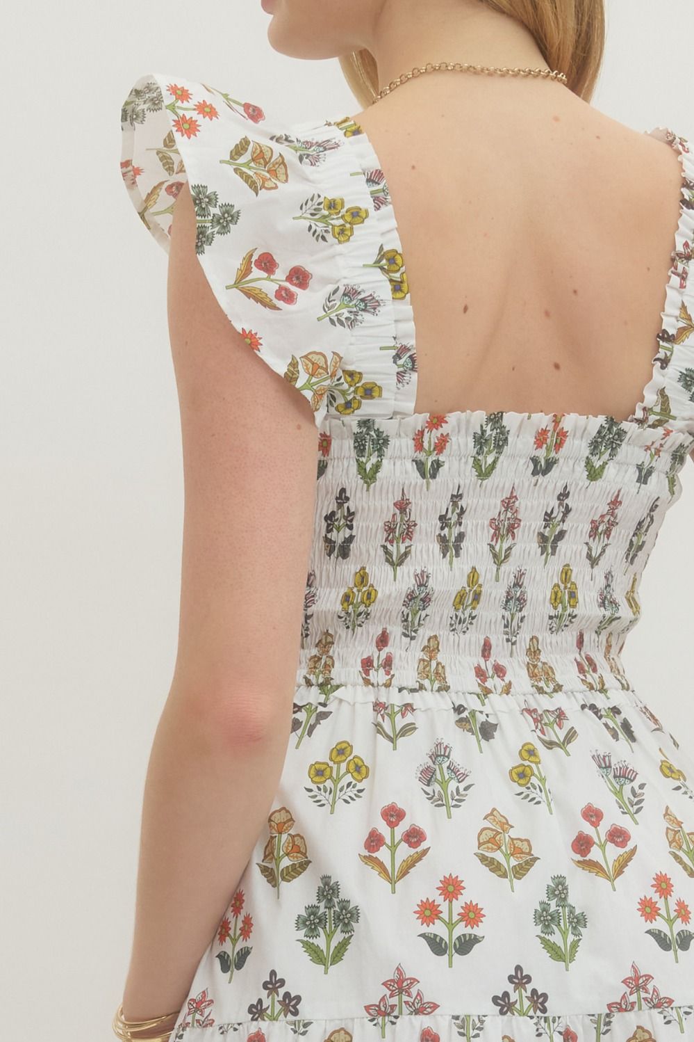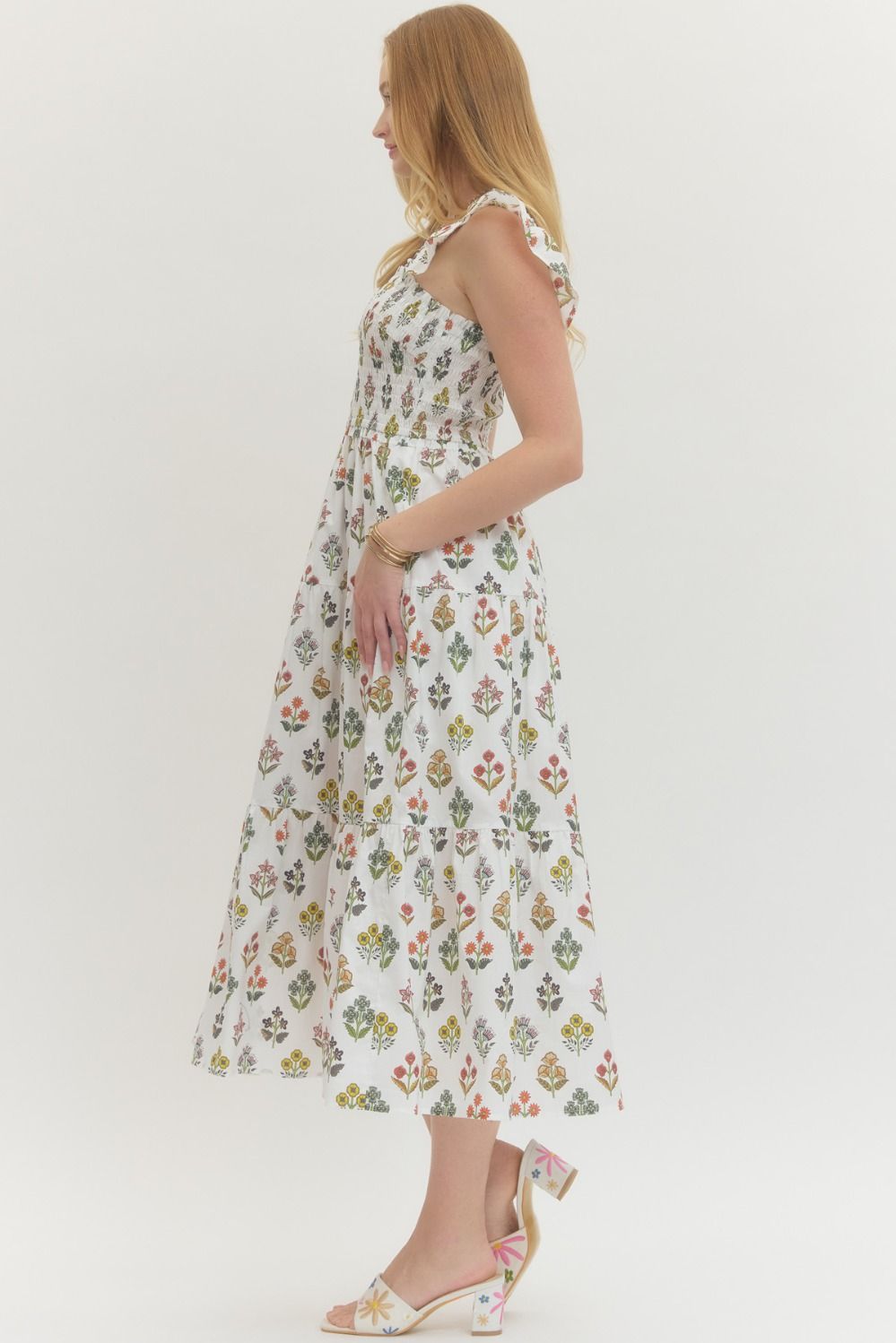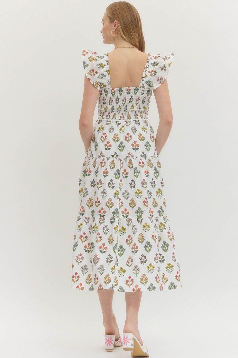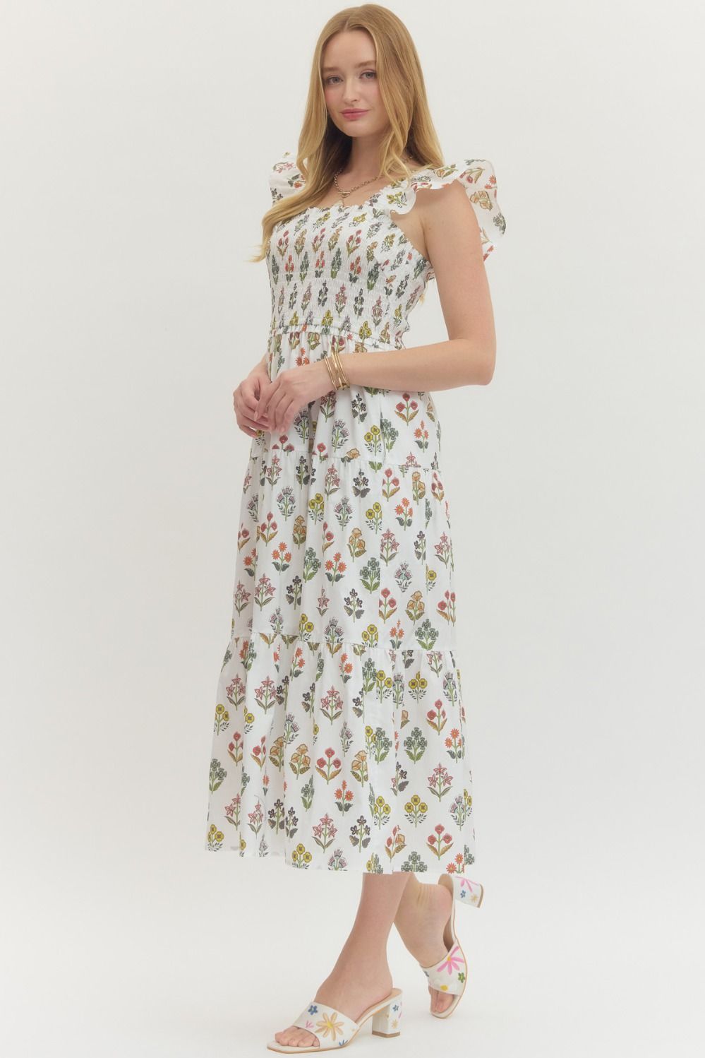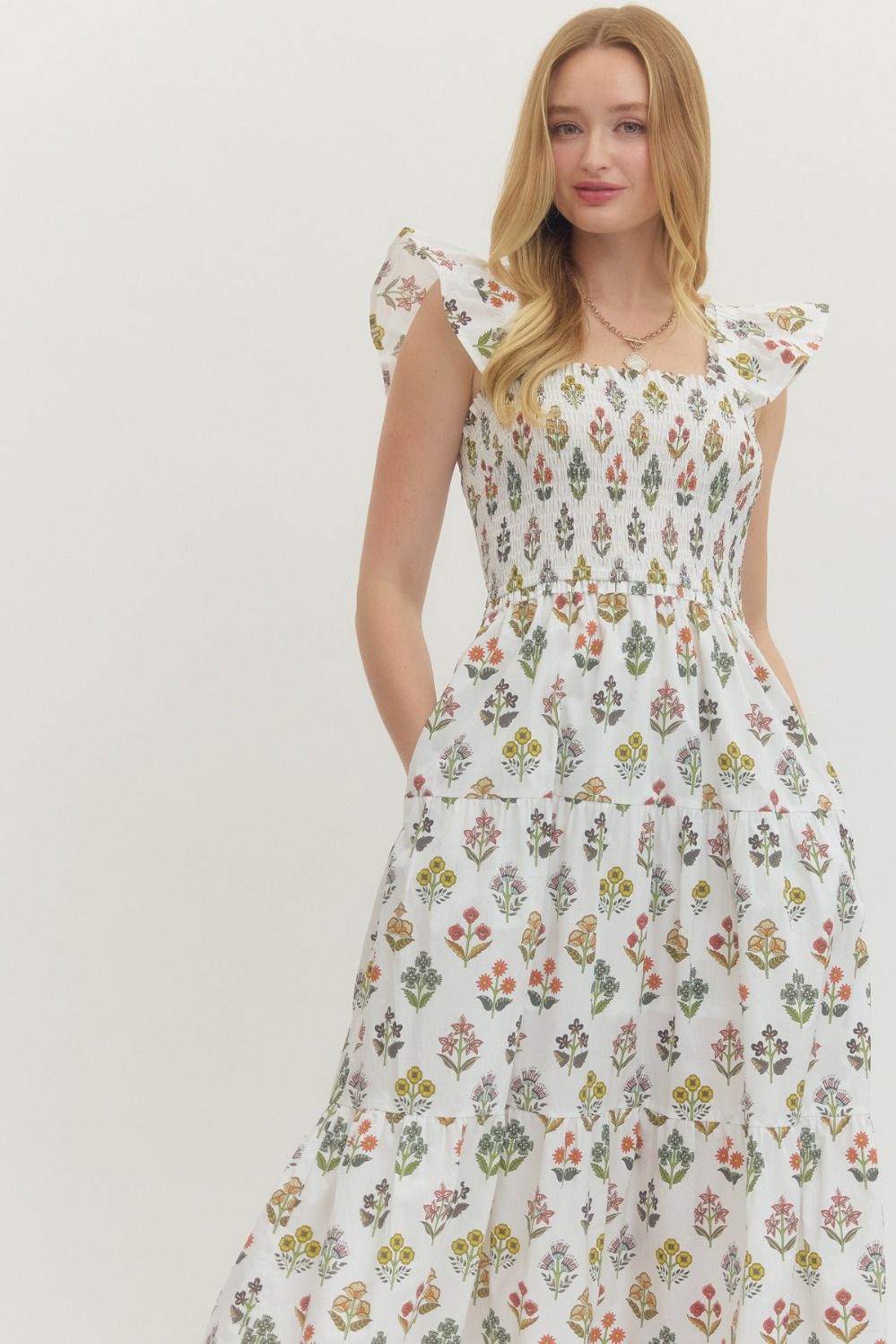 Fresh and feminine, this floral midi dress features a smocked bodice with flutter sleeves and a flowy tiered skirt for an easy, flattering fit. The soft floral print makes it perfect for brunch, showers, and sunny day outings.