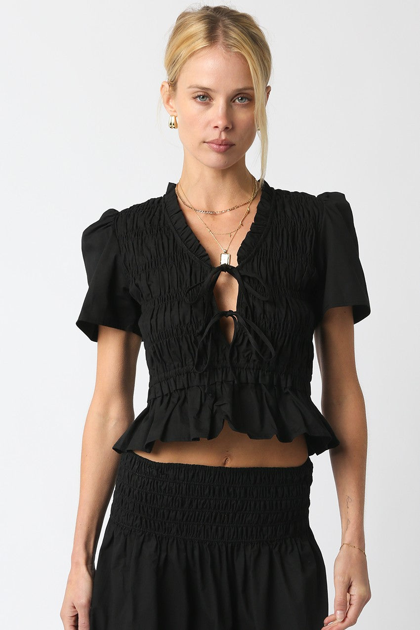 Feminine with a hint of edge, the Noir Romance Tie-Front Top features delicate ruching, soft puff sleeves, and a flirty front tie detail. The cropped silhouette is finished with a subtle ruffle hem, creating a flattering and effortlessly chic look. Perfect for pairing with matching skirts or styling back to denim for an elevated everyday outfit.