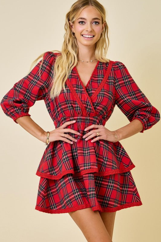 Festive and flirty, the Noelle Plaid Mini Dress is the ultimate holiday look. Featuring classic red tartan plaid with feminine lace trim, a flattering surplice neckline, and a tiered ruffle skirt for extra charm. Perfect for parties, family photos, or cozy celebrations.