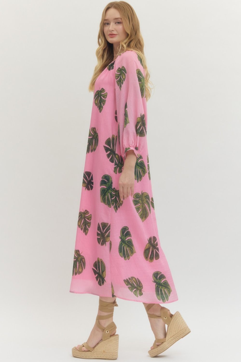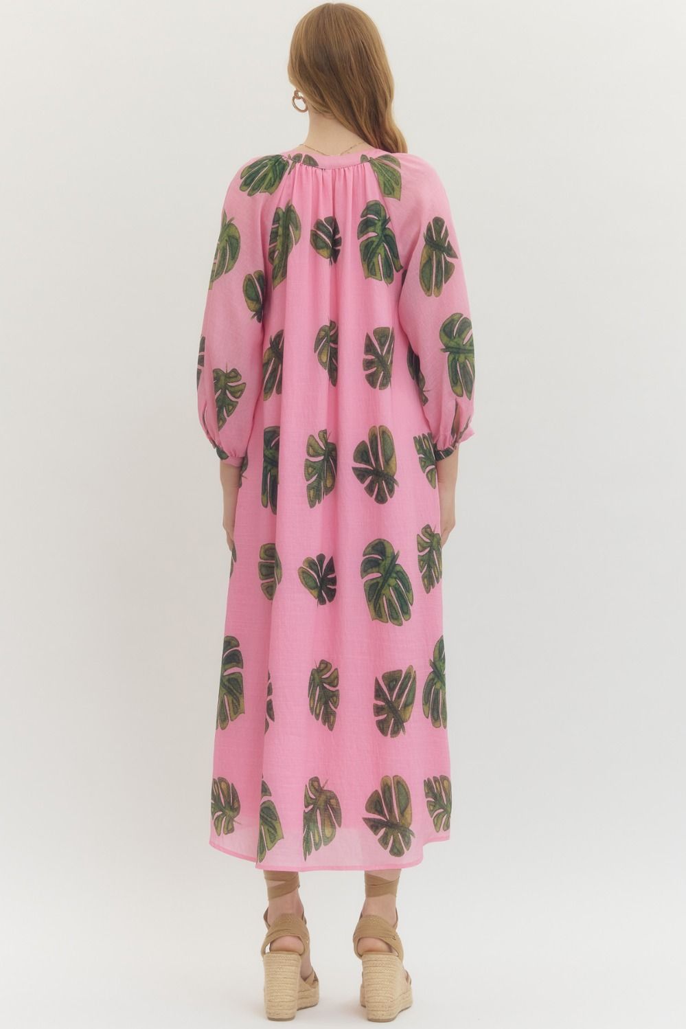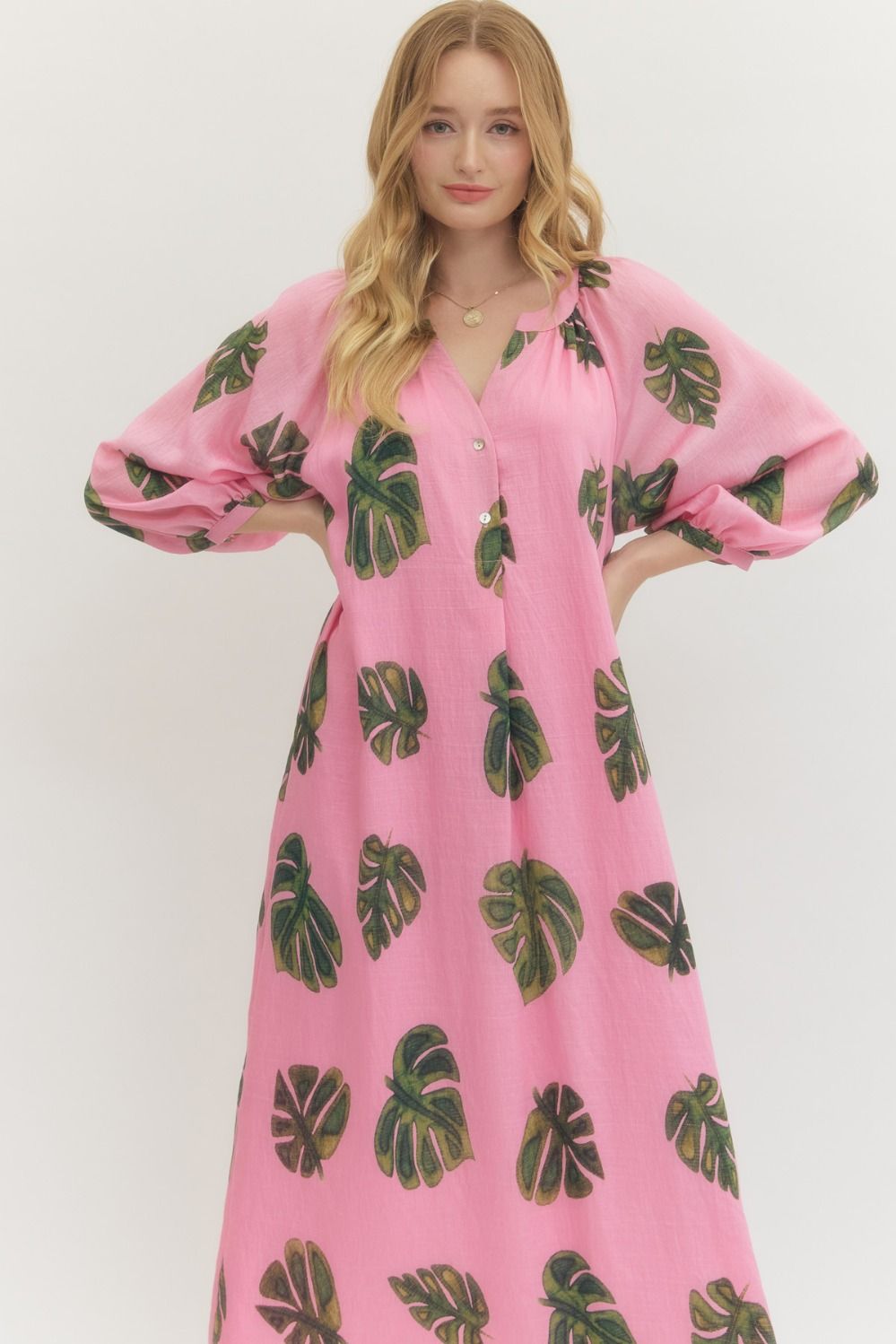 Easy and breezy, this pink maxi dress features a relaxed silhouette with playful tropical leaf print throughout. Designed with a soft V-neckline, button front detail, and flowy sleeves, it’s the perfect throw-on-and-go dress for vacations, beach days, and sunny weekends.
