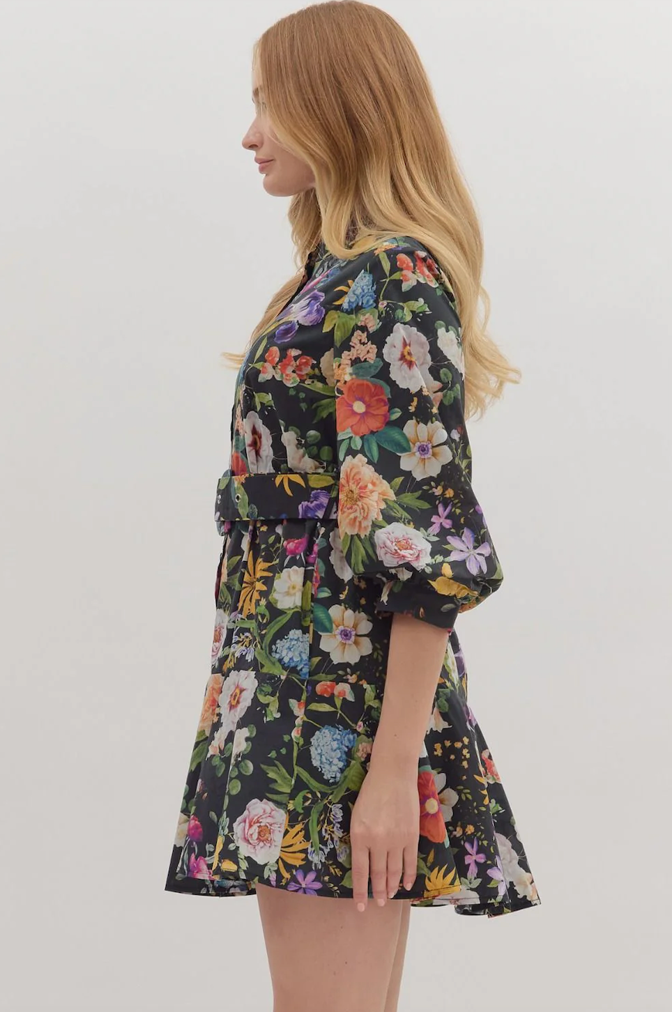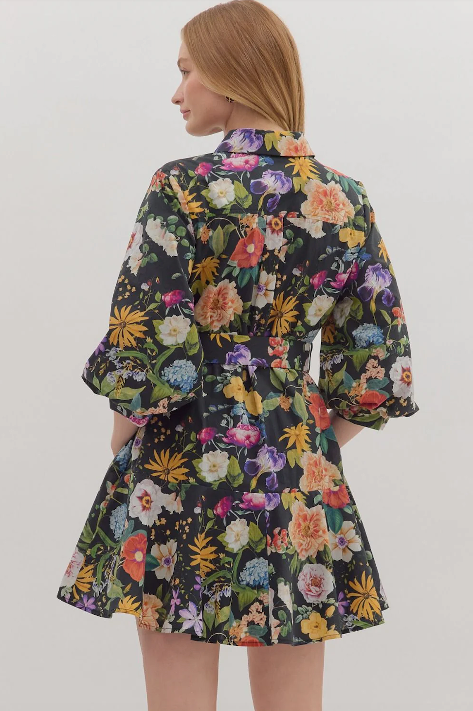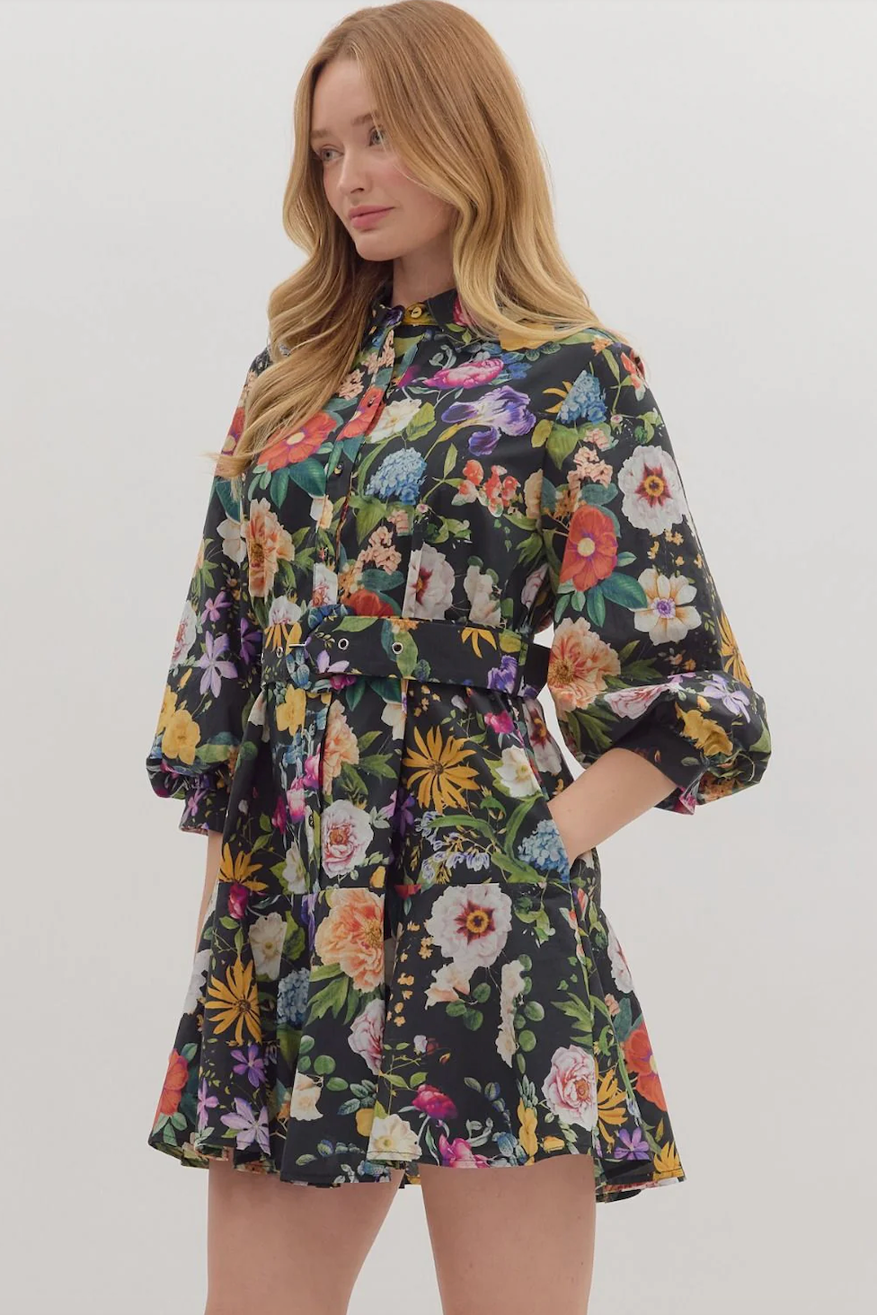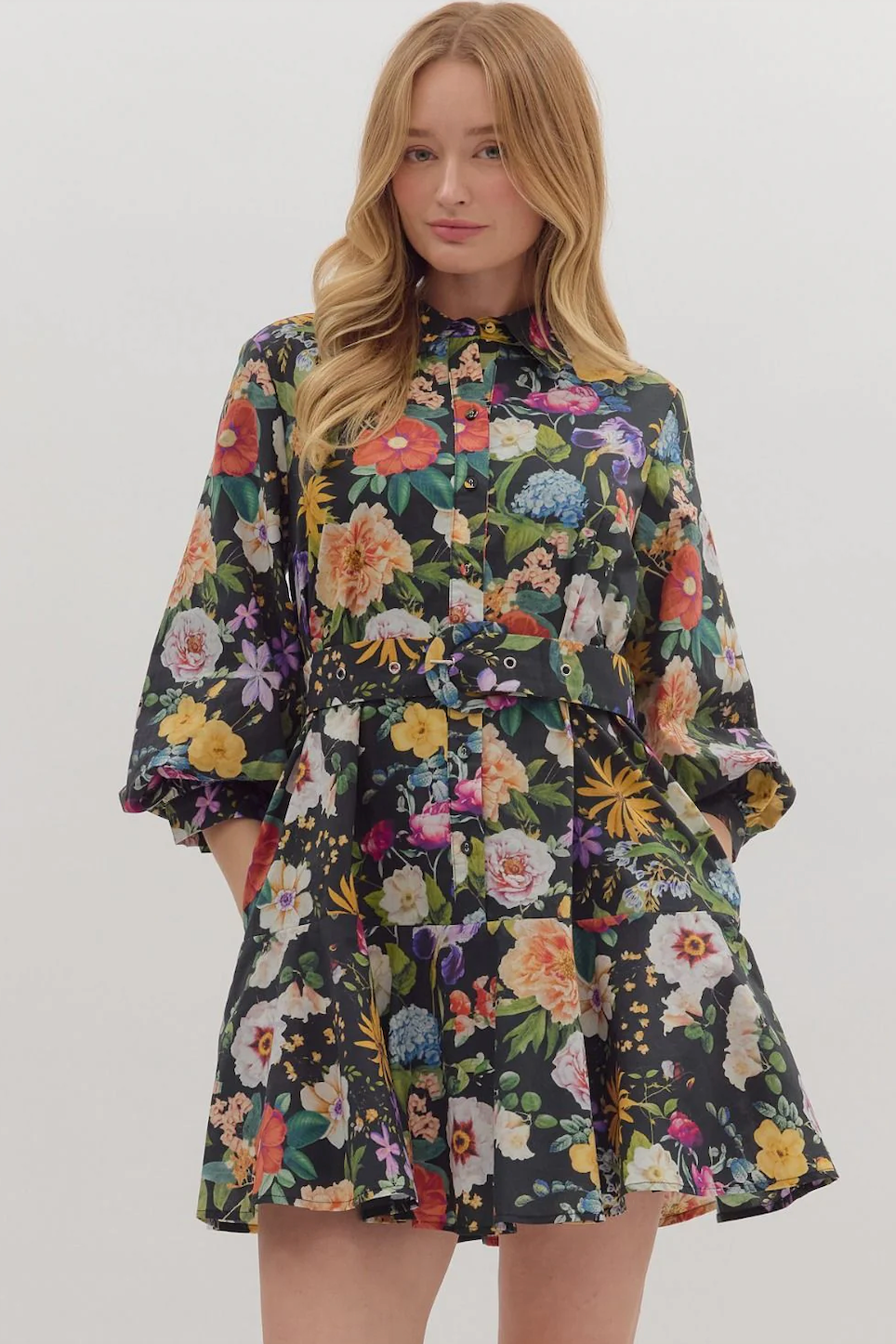 Meet your new statement piece: the Pippa Floral Mini Dress. Bursting with bold color on a dark background, this flirty shirtdress features voluminous sleeves, a belted waist, and a playful tiered skirt. It’s the perfect mix of structure and flow — feminine yet effortlessly cool.