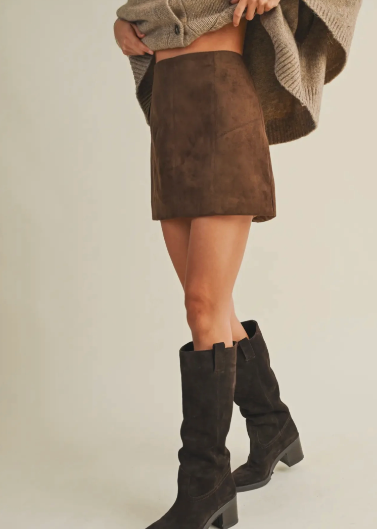 The Rowan Suede Mini is your fall staple — soft, structured, and effortlessly chic. Crafted in rich chocolate faux suede with a clean A-line cut, it pairs perfectly with oversized knits and tall boots for a timeless autumn look.