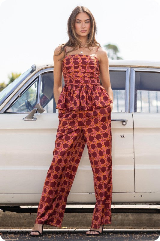 The Marina Geo Peplum Top features a bold burgundy geometric print with a flattering straight neckline, adjustable straps, and a smocked back for the perfect fit. Finished with a soft peplum hem for feminine shape.