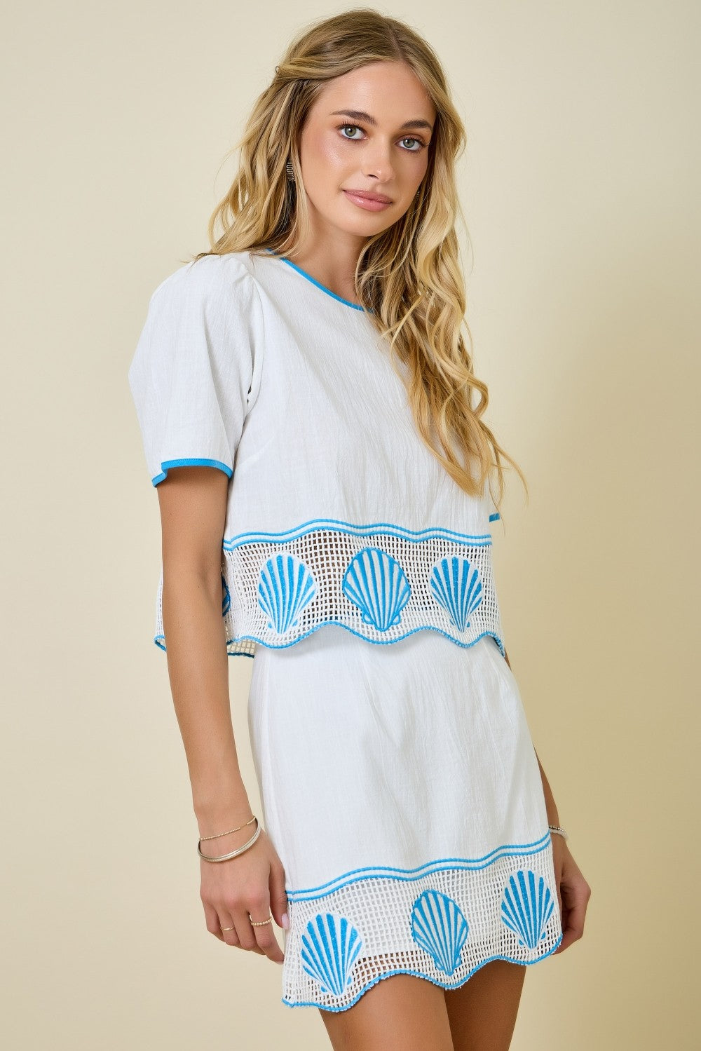 Effortlessly coastal and undeniably chic, the Seaside Scallop Set is your go-to for sunny days and seaside escapes. This two-piece set features a breezy cropped top with soft puff sleeves and delicate blue trim, paired with a matching mini skirt. The standout detail is the intricate scallop shell embroidery along a mesh inset, giving it that elevated, coastal-inspired feel. Lightweight and easy to wear, this set is perfect for brunch, beach vacations, or strolling through town in style.