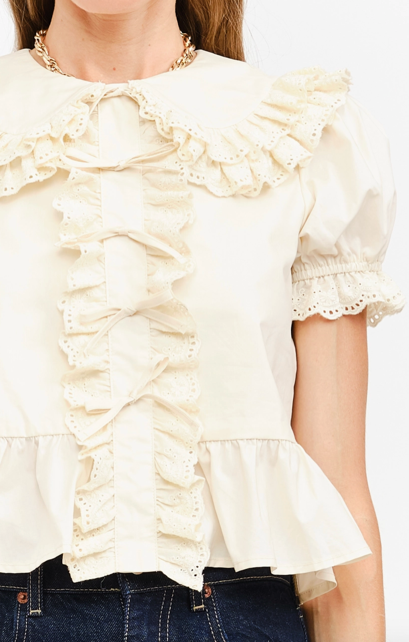 Romantic and feminine, the Gianna Blouse features ruffled trim, puff sleeves, and sweet bow details. Finished with a peplum hem for a flattering fit.