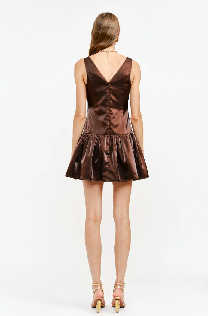Polished and chic, the Luna Mini Dress features a satin finish, structured bodice, and flirty ruffle hem. The rich chocolate hue makes it perfect for fall soirées and elegant nights out.