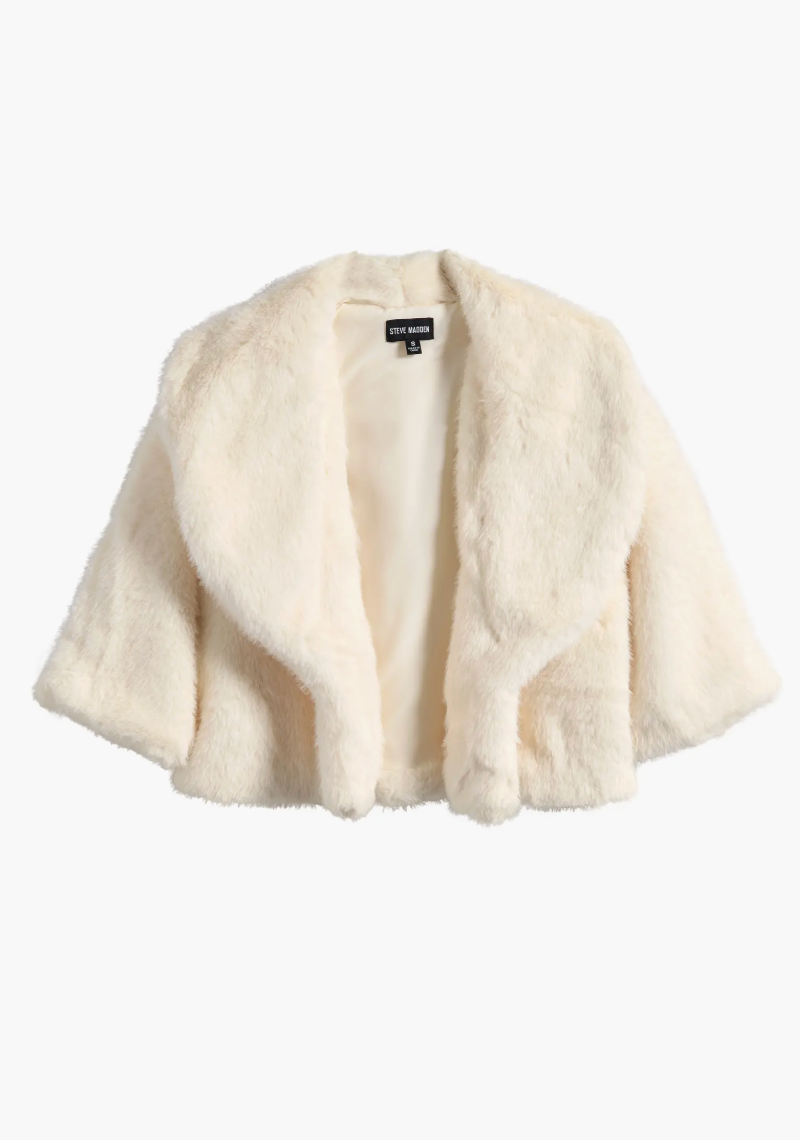 The Hestia jacket is a dreamy, soft faux-fur topper that instantly elevates any outfit. With its cropped silhouette and open front drape, it’s the perfect layer for holiday parties, winter weddings, and glam nights out.