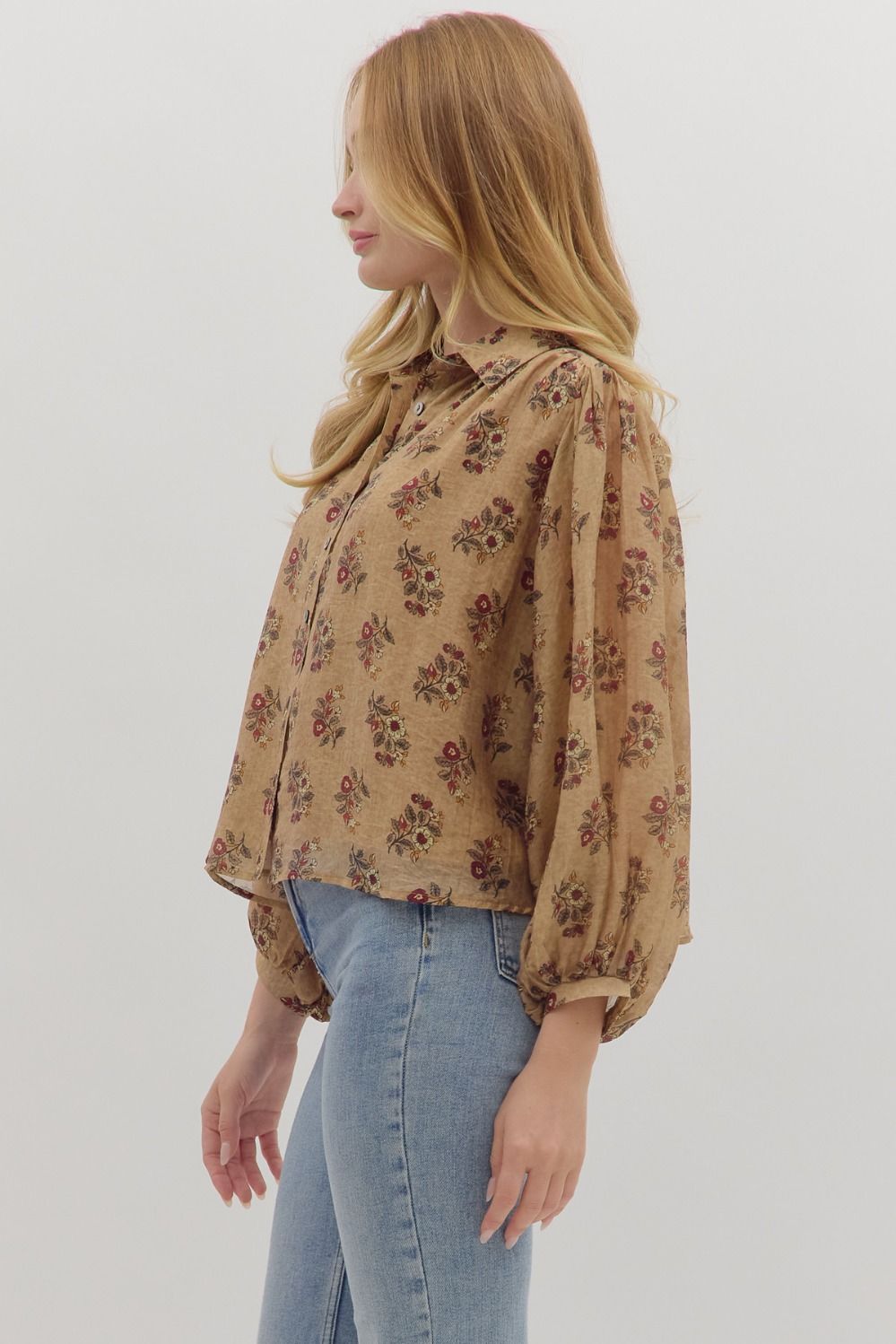 A fall favorite with vintage charm, the Tessa Floral Blouse features a warm camel base with a delicate floral print. Designed with a button front, puff sleeves, and a relaxed silhouette that drapes effortlessly. Perfect for pairing with denim or tucking into a suede skirt for a timeless autumn look.