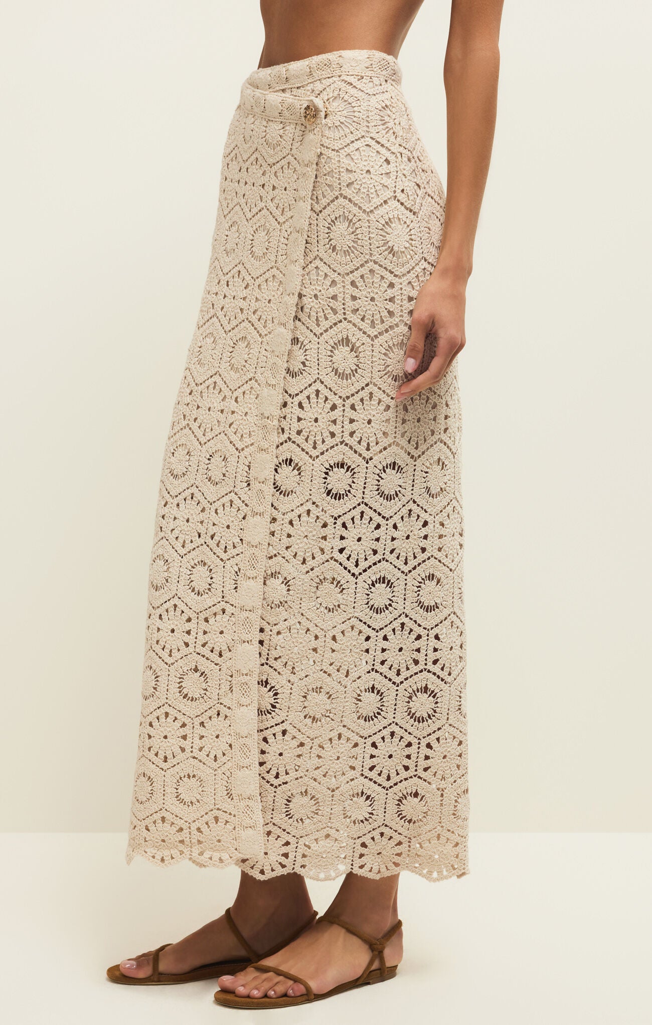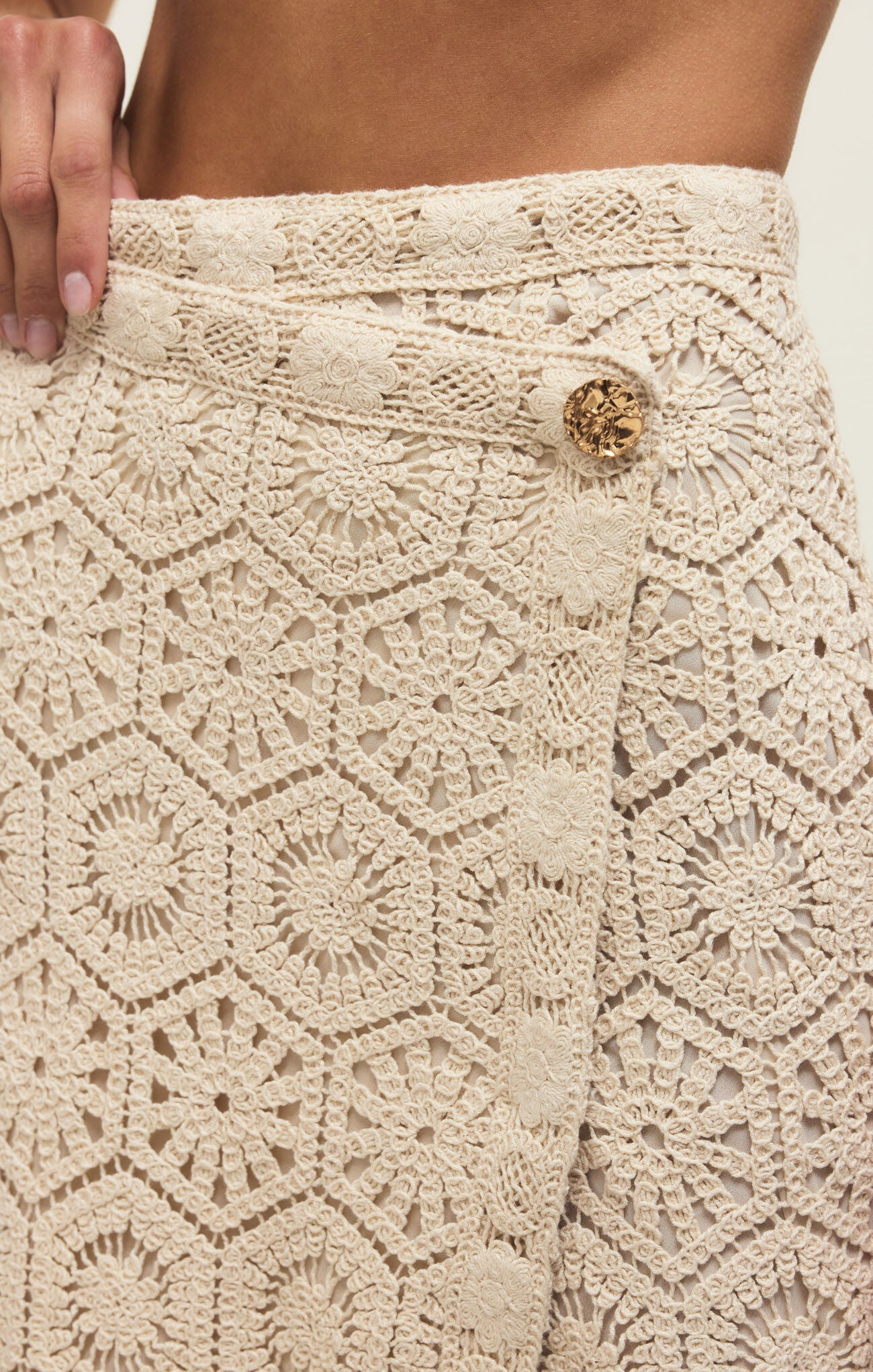 An effortlessly elevated piece with a coastal, feminine feel. The Raquel Lace Wrap Skirt features intricate crochet lace throughout in a soft natural hue, creating a beautifully textured look that feels both timeless and modern. The wrap silhouette adds movement and versatility, while the delicate button detail at the waist gives it a polished finish. Perfect styled with the matching top or paired back to a simple tank for an easy, chic moment.