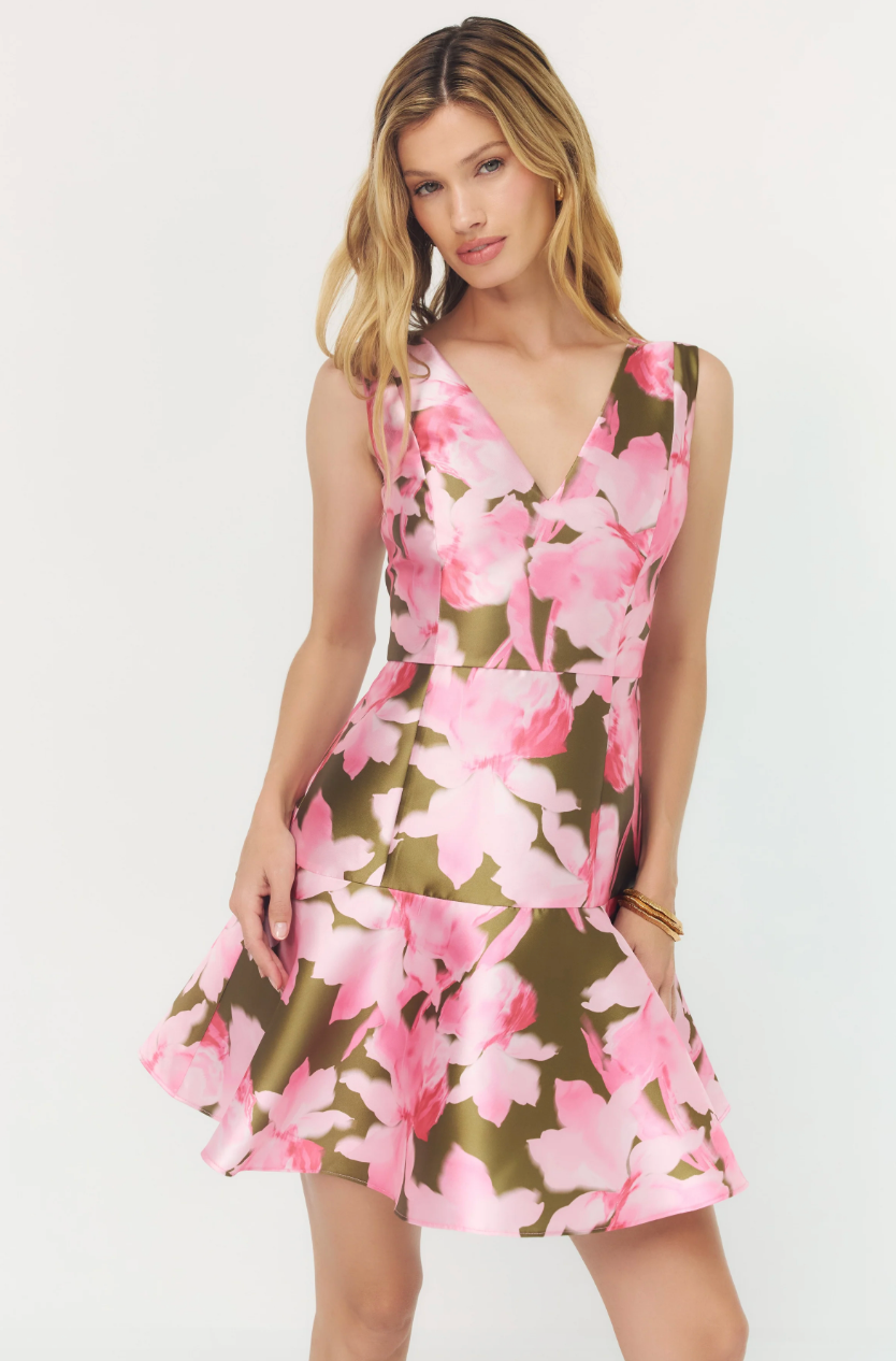 A flirty, feminine mini dress featuring a flattering V-neckline and vibrant pink floral print set against a rich olive backdrop. The fitted bodice flows into a playful flounced skirt, creating beautiful movement perfect for parties, showers, and special events.
