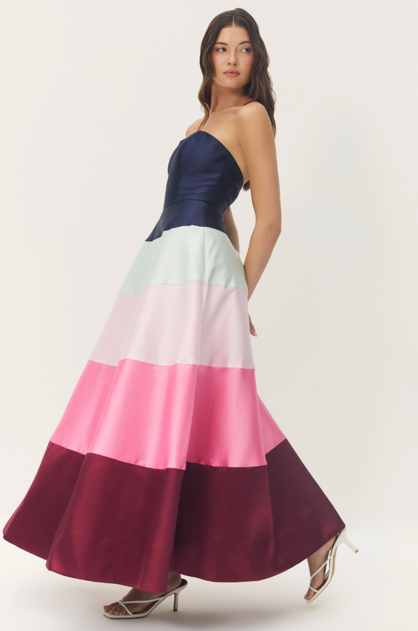 A stunning strapless gown featuring a structured navy bodice and a flowing colorblock skirt in mint, blush, vibrant pink, and rich wine tones. The full A-line silhouette and satin finish create beautiful movement, making it perfect for weddings, galas, and formal events.