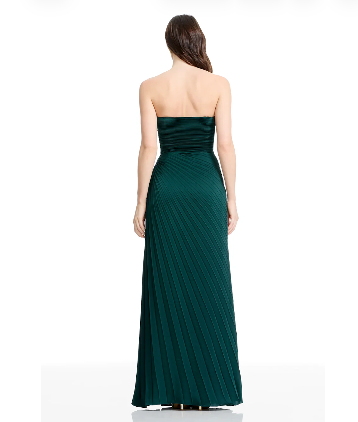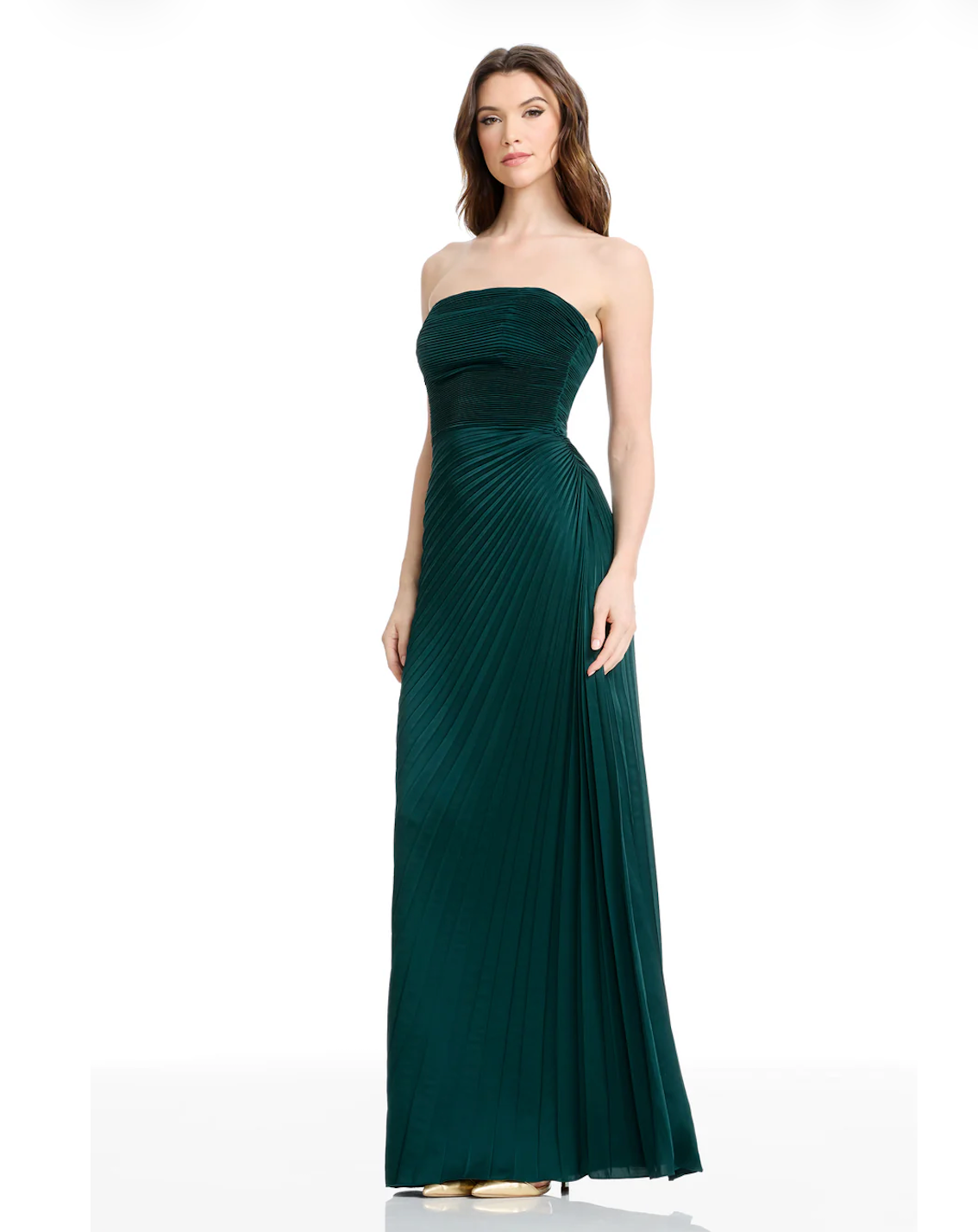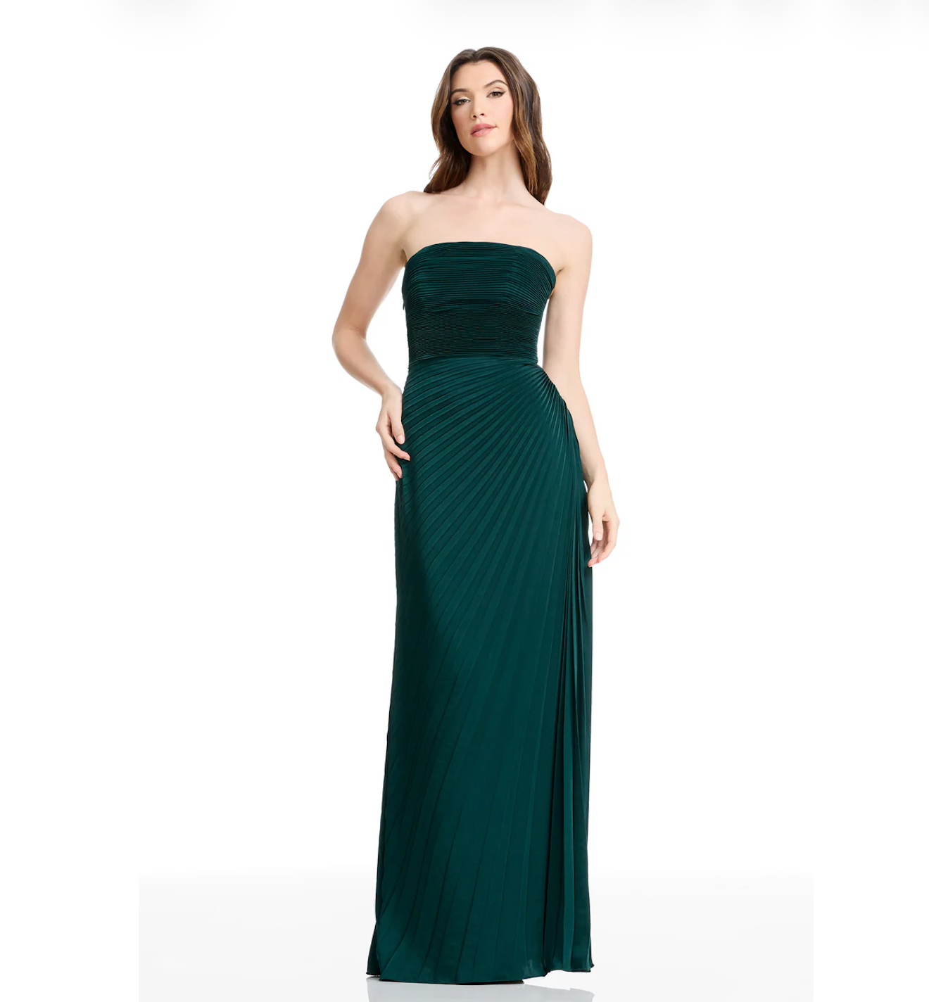 An elegant strapless gown in a rich pine green, designed with fine pleating throughout for a sculpted yet fluid silhouette. The structured bodice offers a flattering fit, while diagonal pleating at the waist enhances shape and elongates the figure. Finished with a flowing floor-length skirt that moves beautifully with every step.