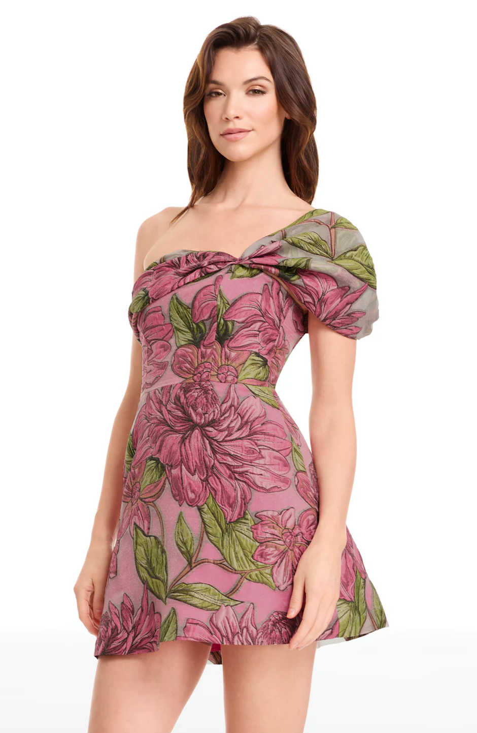 A statement mini with bold florals and a one-shoulder puff sleeve. The fitted bodice and subtle A-line skirt create a flattering, feminine silhouette perfect for special occasions.