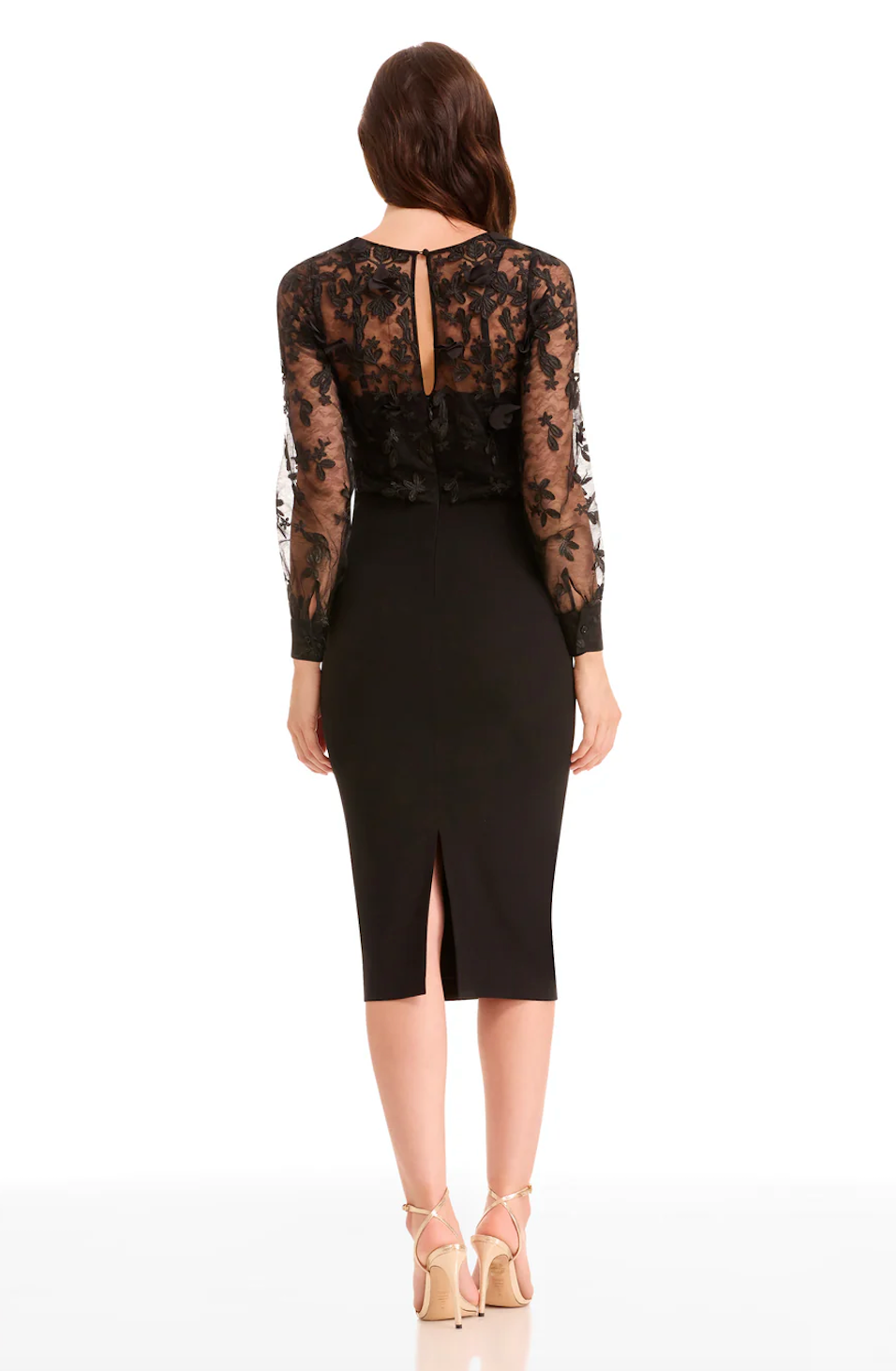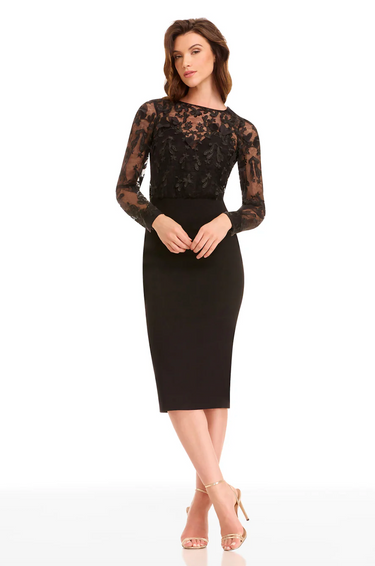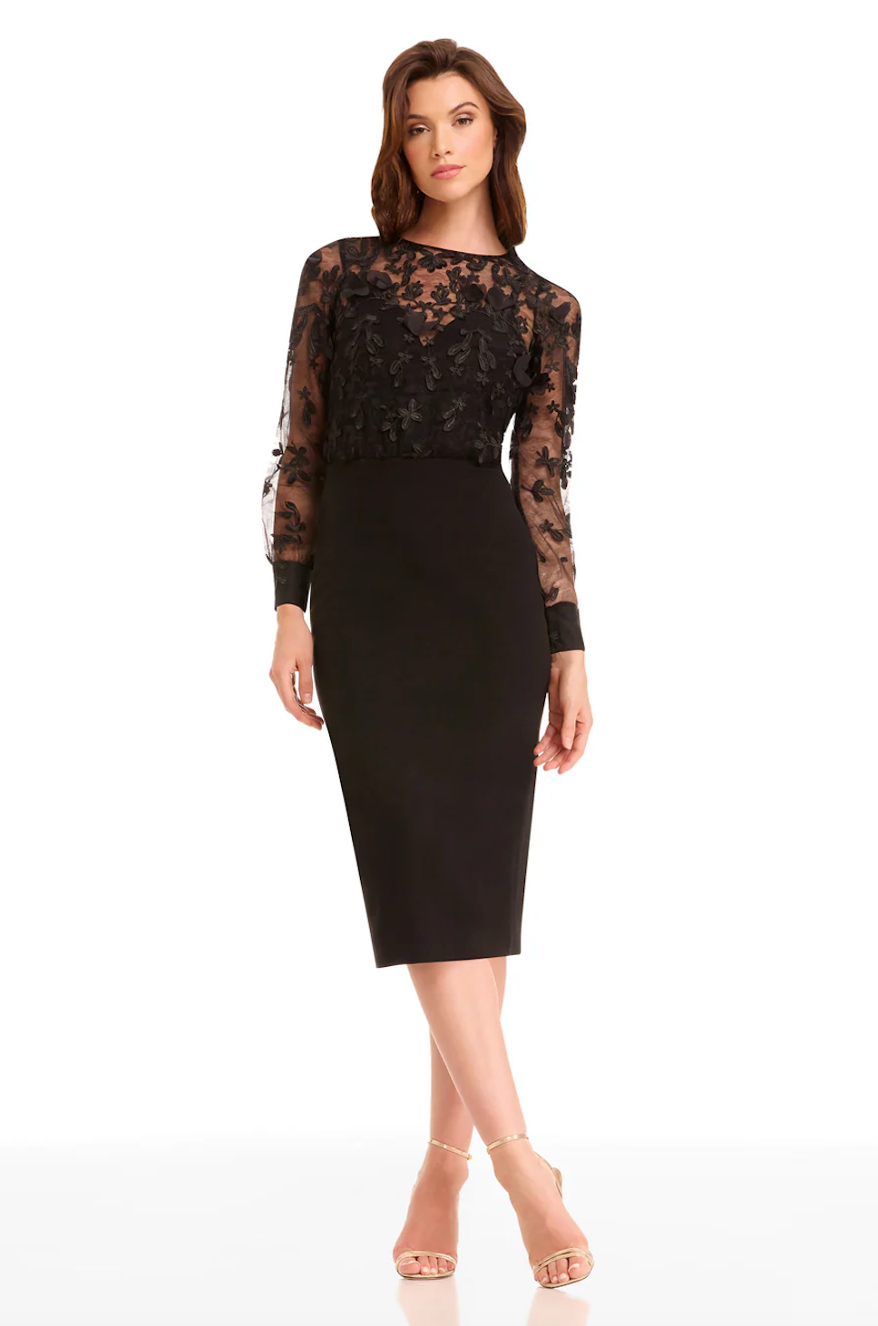 The Pilar Dress is the definition of timeless sophistication. This fitted midi features a sleek pencil skirt paired with a sheer embroidered lace bodice that brings romantic detail to a modern silhouette. Long illusion sleeves with floral appliqué add texture, while the back keyhole with button closure finishes the look with understated elegance. Perfect for cocktail parties, formal dinners, or black-tie weddings.