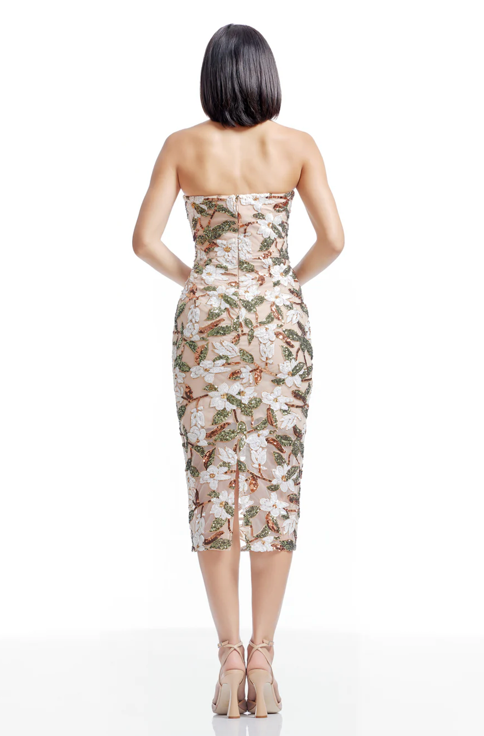 Sophisticated and striking, the Shailene Dress is a strapless midi that makes a statement. Crafted with nude mesh embroidered in shimmering sequins and florals, this fitted silhouette highlights your curves while maintaining elegance. Perfect for galas, cocktail parties, and weddings.