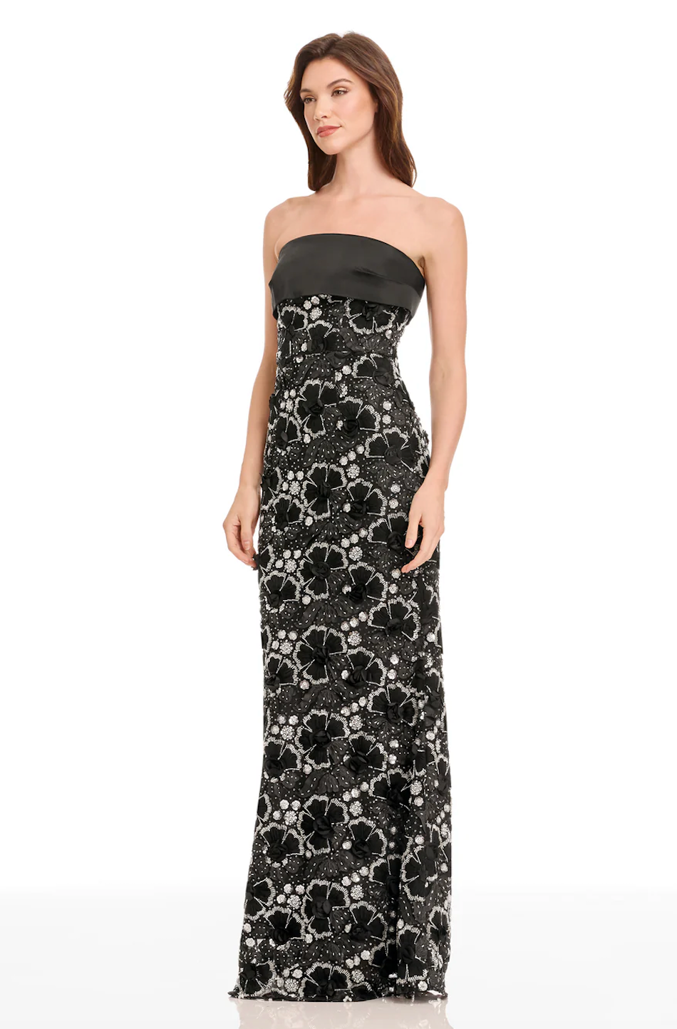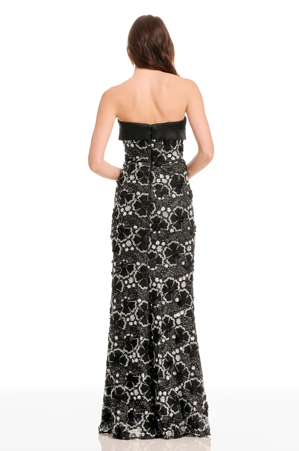 Make an unforgettable entrance in this strapless black gown featuring a satin fold-over neckline and intricate floral lace with sequin and bead embellishments. The fitted silhouette and gentle flare add timeless sophistication.