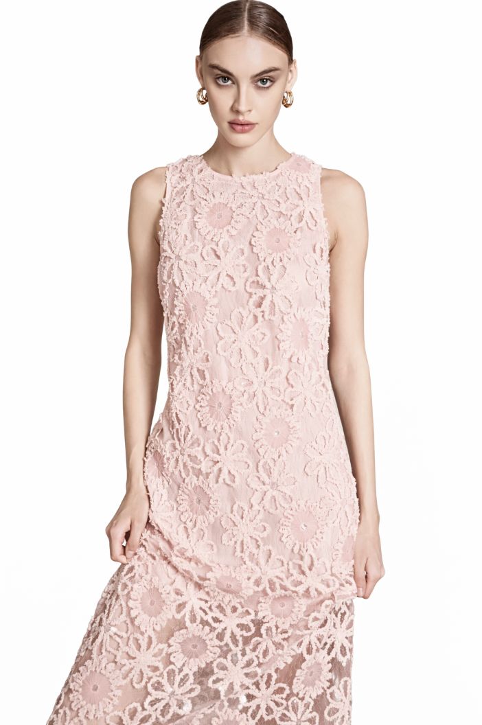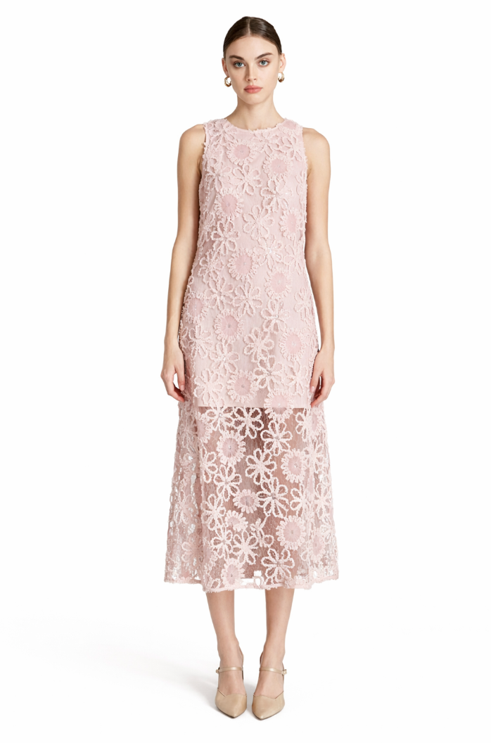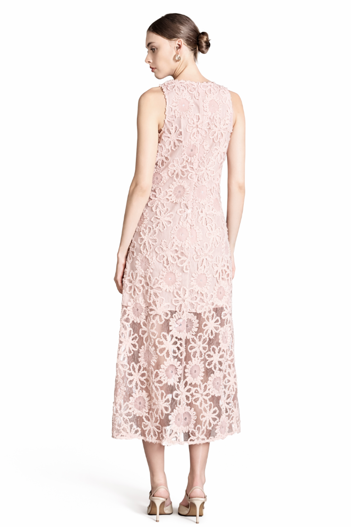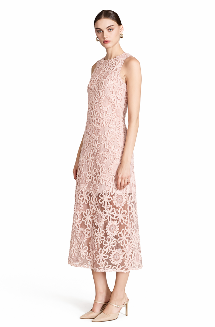 Romantic and refined, the Elodie Lace Midi Dress brings timeless femininity to any special occasion. Designed with intricate floral lace throughout, this elegant silhouette features a high neckline and tailored bodice that softly flows into a semi-sheer lace midi skirt. The delicate blush tone and dimensional lace texture create a soft, sophisticated look that feels both classic and modern.