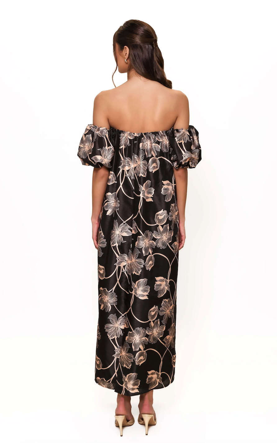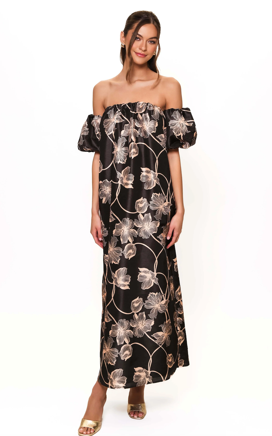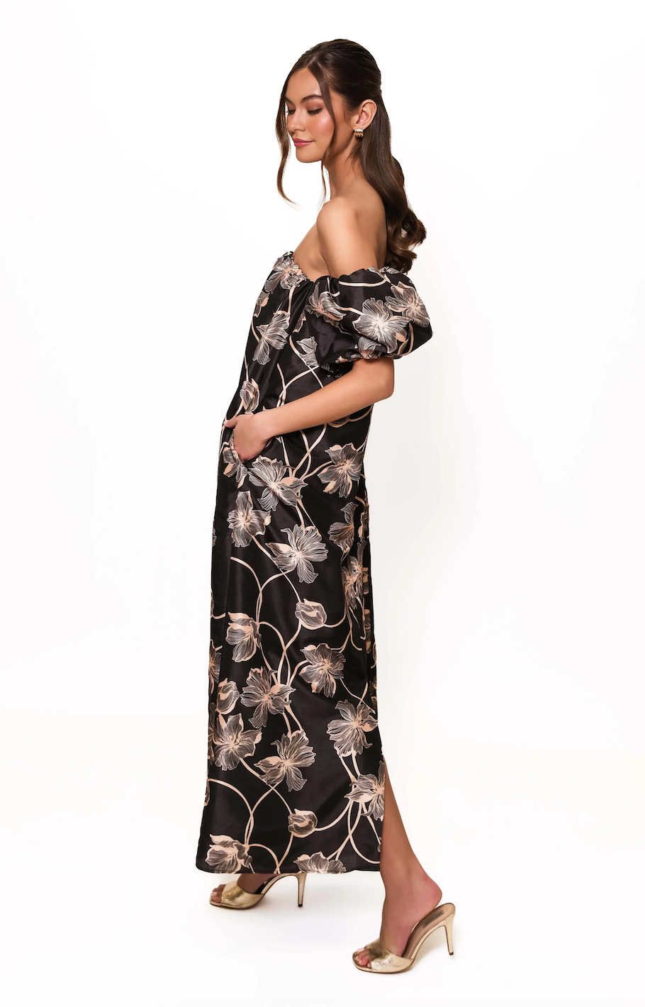 Step into effortless elegance with the Claire Off-Shoulder Maxi Dress. Designed in a luxe satin finish, this flowy silhouette features voluminous puff sleeves and a straight, off-the-shoulder neckline for a chic yet relaxed look. The black base is adorned with an allover vining floral print in soft champagne tones, creating a striking yet timeless statement.