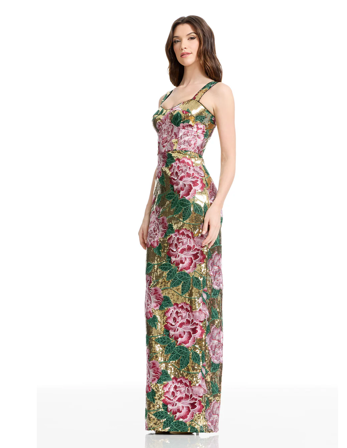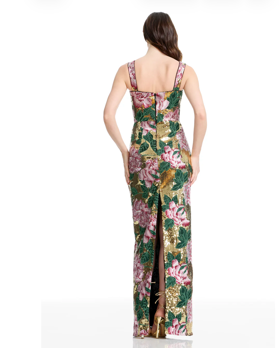 Make a statement in this stunning floral sequin gown designed to shine from every angle. Featuring a structured bodice with wide straps and a flattering square neckline, this floor-length silhouette is fully adorned in shimmering sequins with a rich floral pattern. The fitted shape highlights the waist and hips, while a back slit allows for effortless movement and an elegant finish.