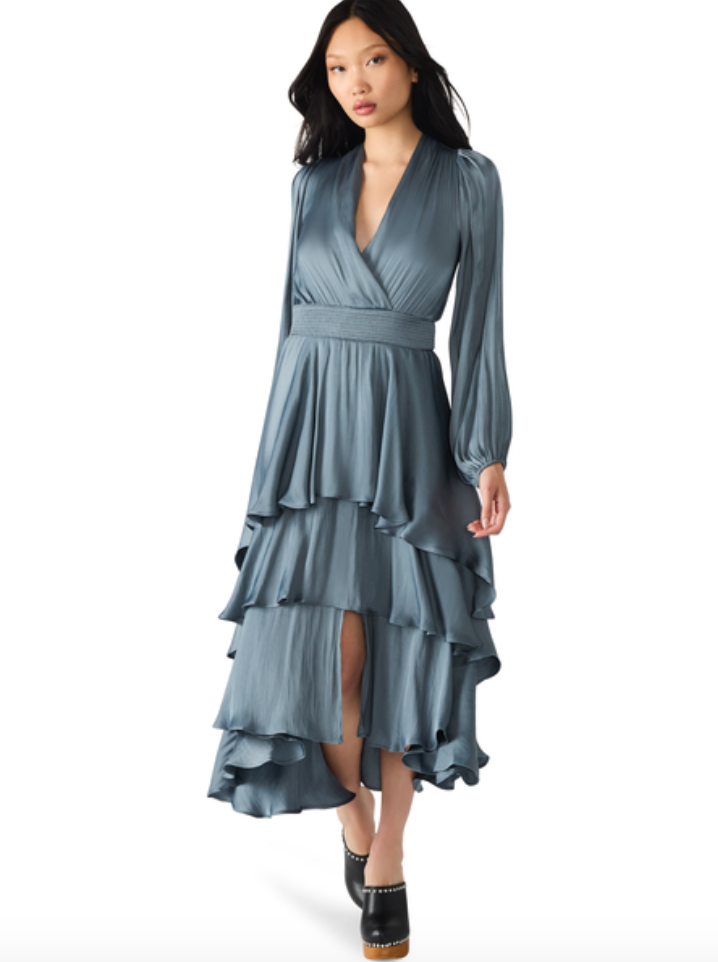 The Bei Midi Dress exudes elegance with its soft sheen and romantic tiers. Crafted in a dreamy cloud grey, this dress features a deep V-neckline, long blouson sleeves, and a wide smocked waistband that defines the silhouette. The cascading tiered skirt flows beautifully with every step, finished with a front slit for a touch of allure. Perfect for weddings, evening events, or any moment you want to stand out.