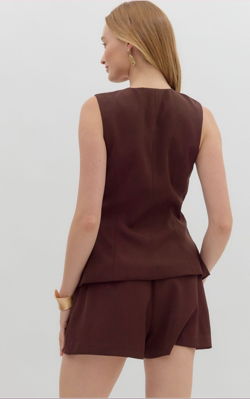Command the room with tailored elegance in the Sleeveless Round Neck Playsuit in Chocolate Brown by Entro. This versatile one-piece blends sophistication with a modern edge, perfect for making a bold statement.
