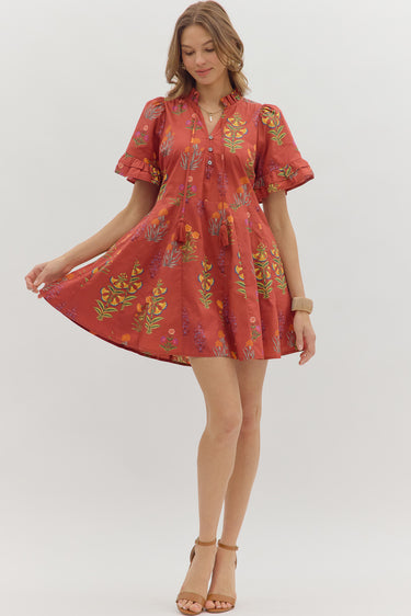 Fresh and feminine, the Dahlia Mini Dress is your go-to piece for easy elegance. Designed with a rich terracotta base and vibrant floral print, this dress is bursting with color and charm. The flutter sleeves with ruffle detail, tassel-tie neckline, and subtle pleating add playful movement to its breezy silhouette. Perfect for daytime outings, brunch, or garden parties, it’s a standout style you’ll reach for again and again.