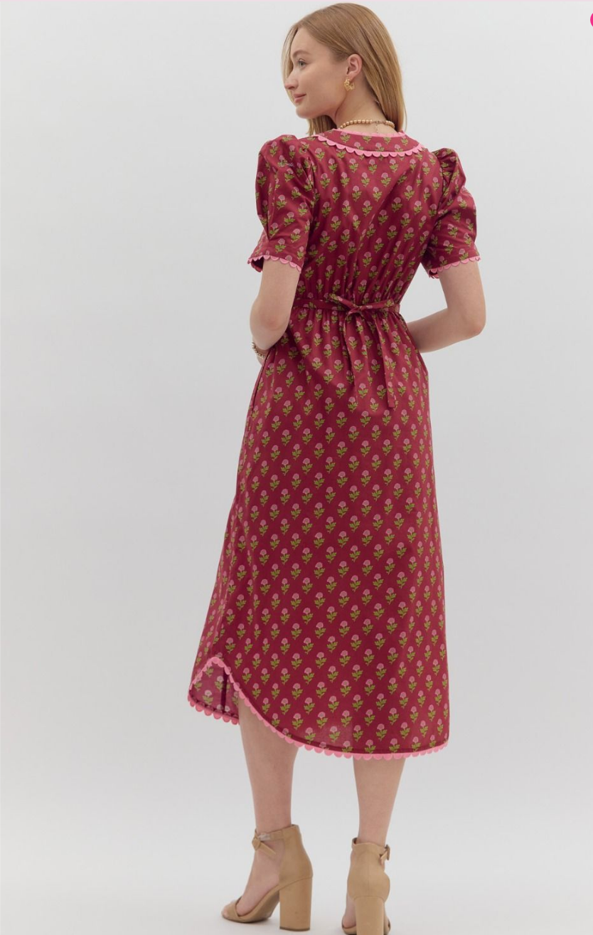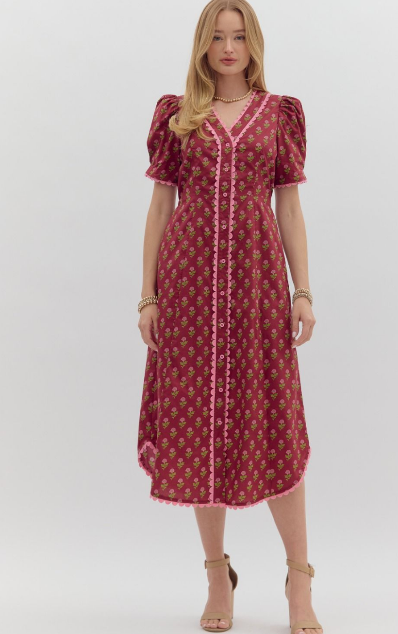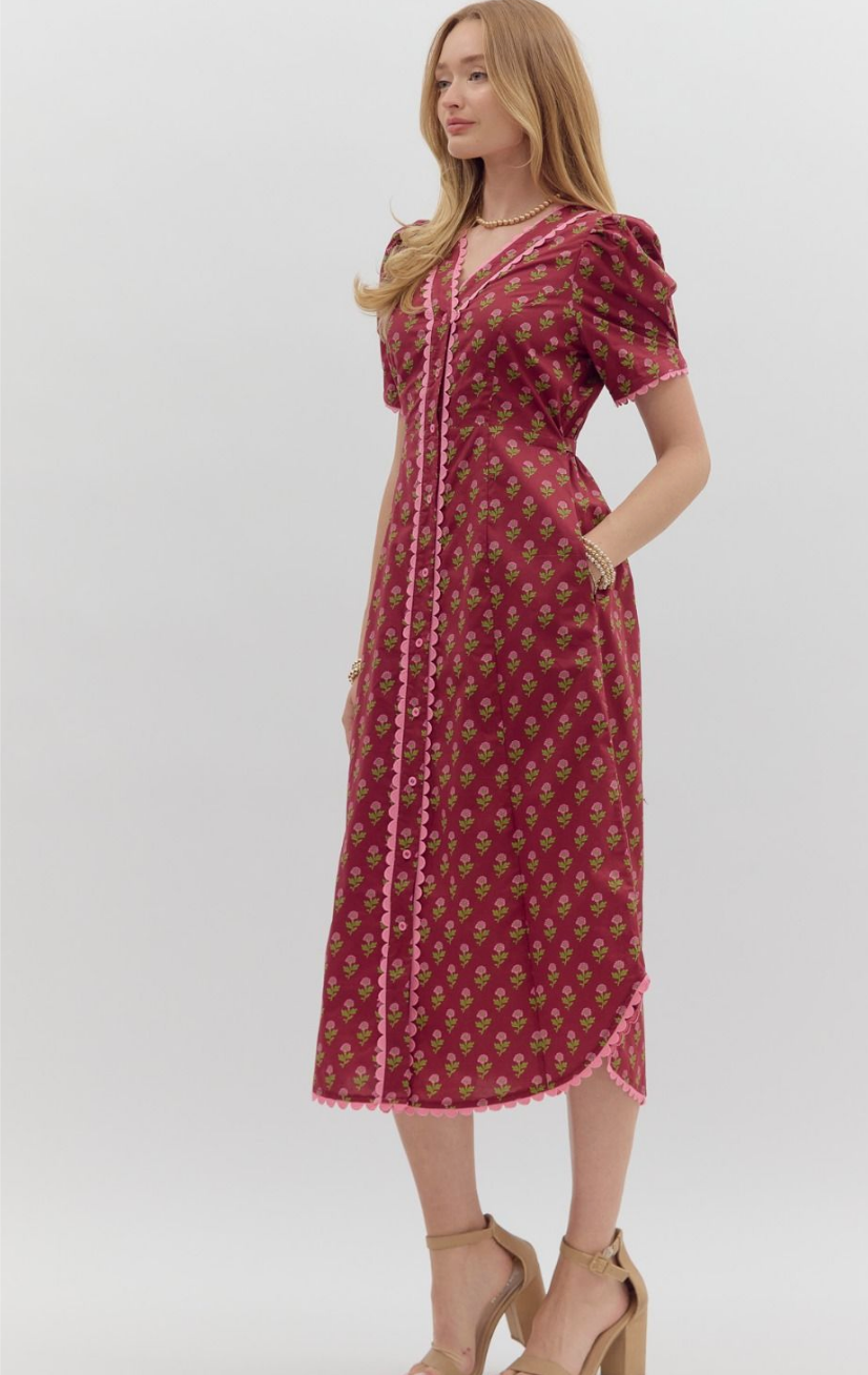 Step into vintage-inspired elegance with the Floral Scalloped Midi Dress in Burgundy. Featuring a charming rosebud print throughout and vibrant pink scalloped trim, this dress brings feminine flair to your wardrobe.