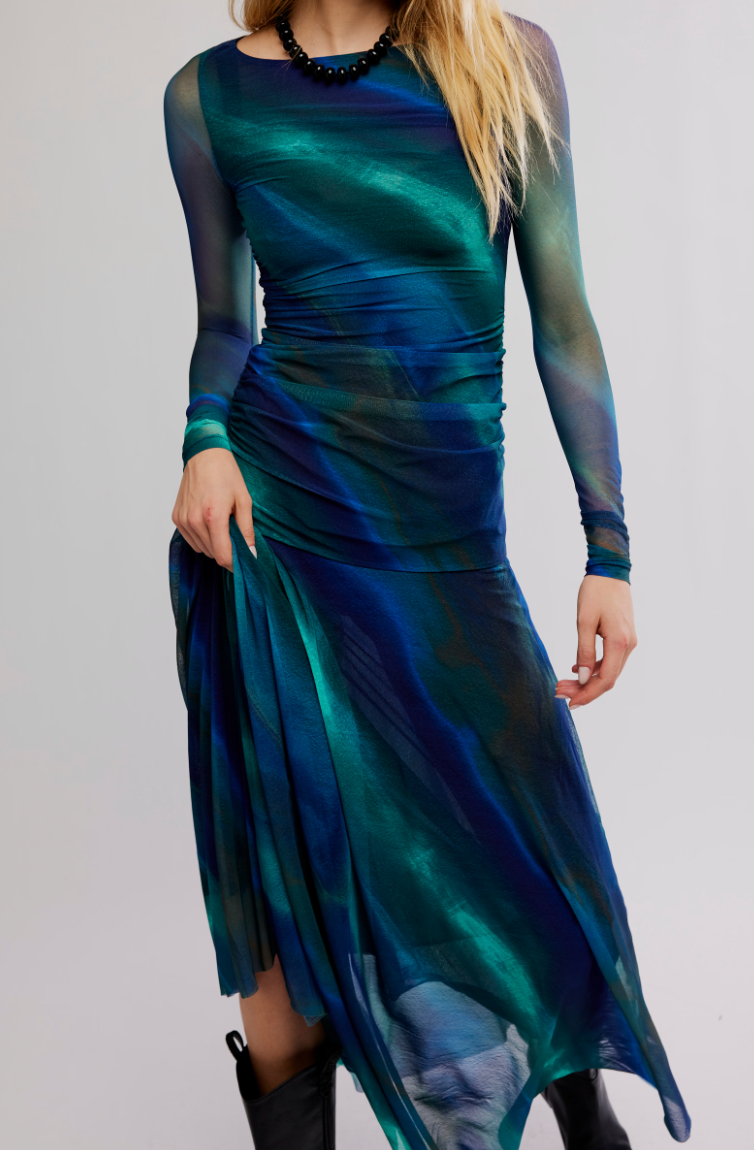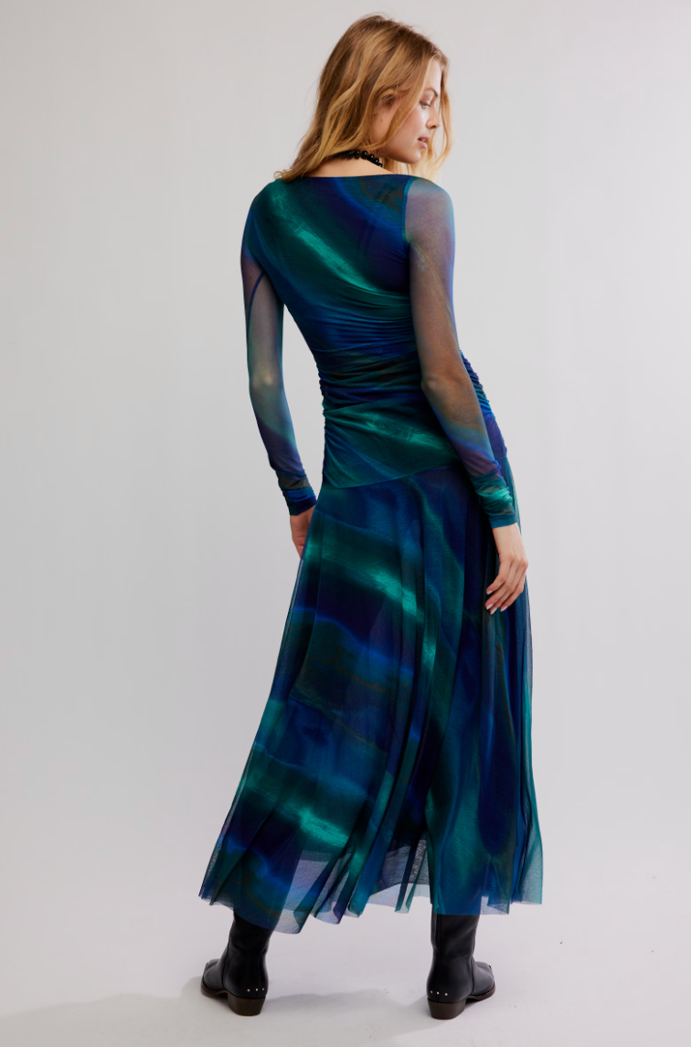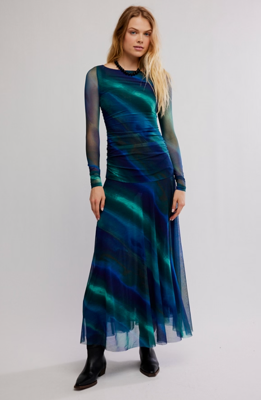This deep-ocean maxi dress delivers a sleek, modern silhouette with effortless movement. Designed in a sheer mesh fabrication with rich tonal shading, it features subtle ruching through the bodice and a softly flowing skirt that flatters without feeling fussy. Long sleeves and a clean neckline give it an elevated, understated finish.