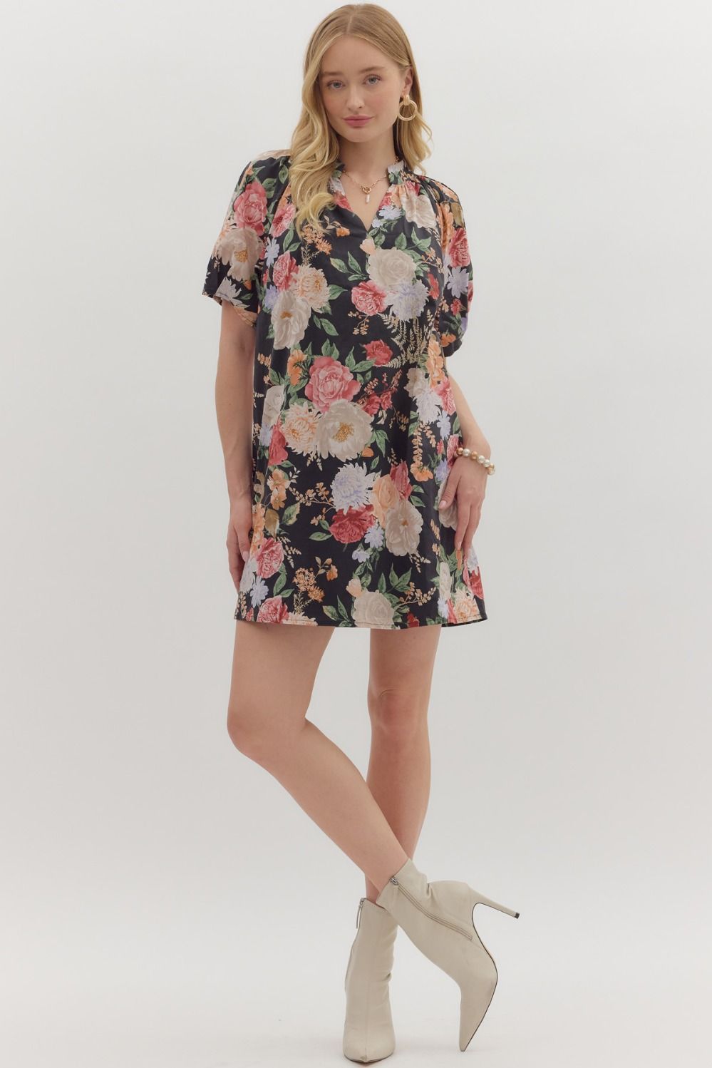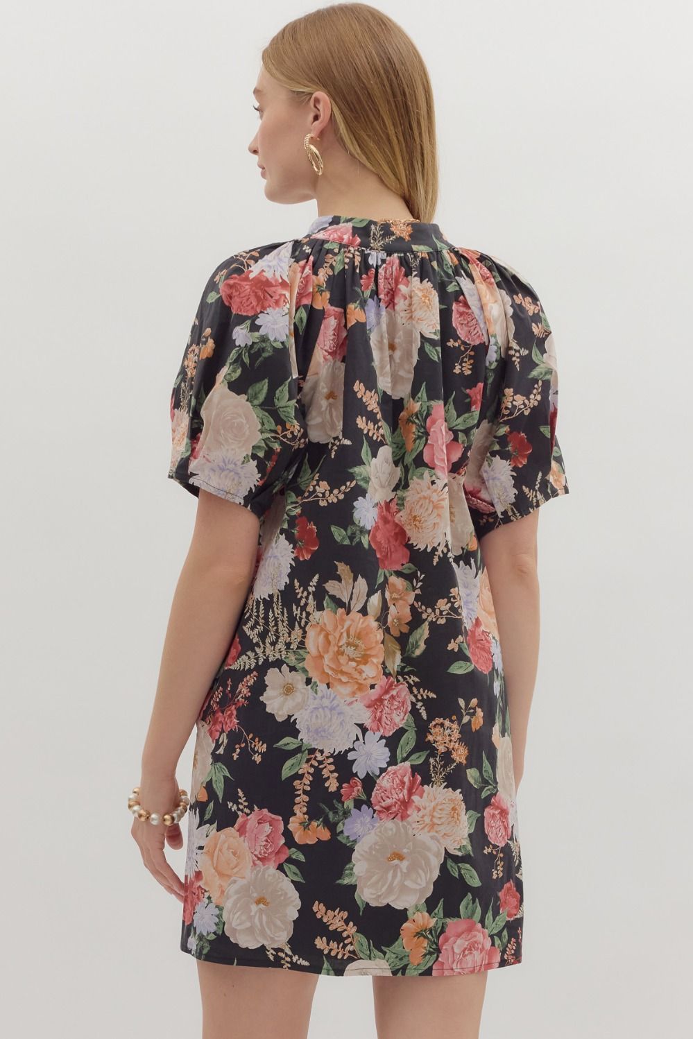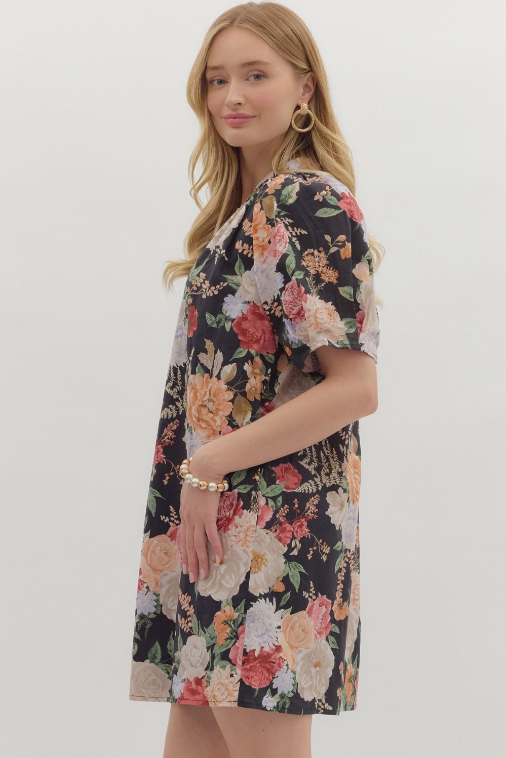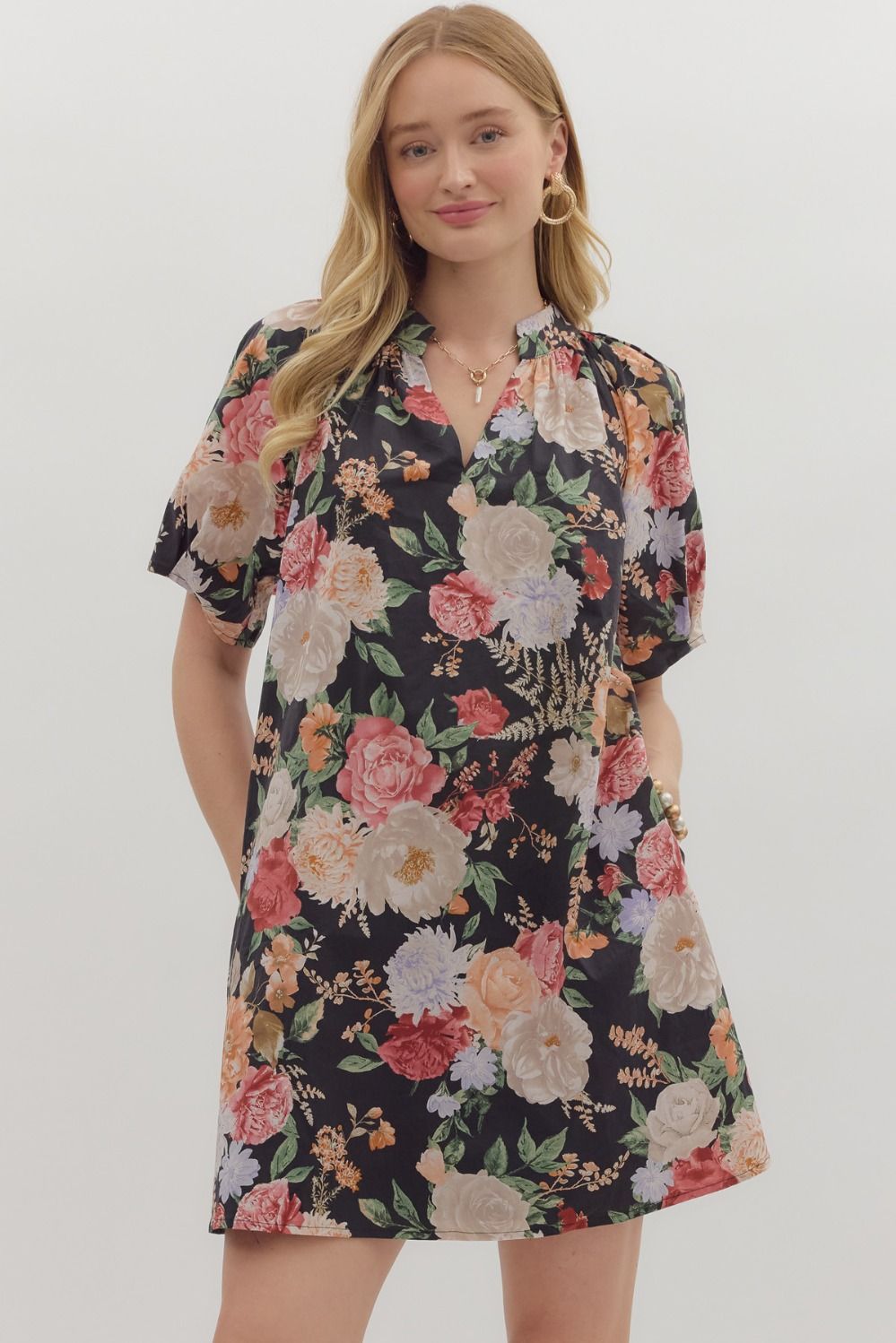 Romantic and versatile, the Juliette Dress is a floral dream. Designed with a relaxed shift silhouette, this mini features a split neckline, short puff sleeves, and hidden side pockets for ease. The black base is adorned with lush oversized florals in soft blush, coral, lavender, and cream tones, giving it an effortlessly feminine feel. Lightweight and flowy, it’s perfect for everything from brunch dates to evening outings.