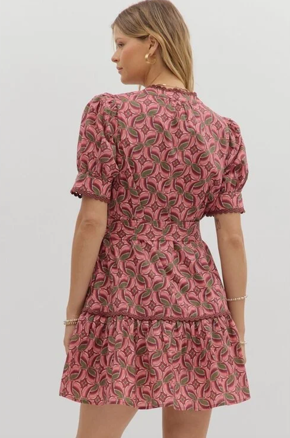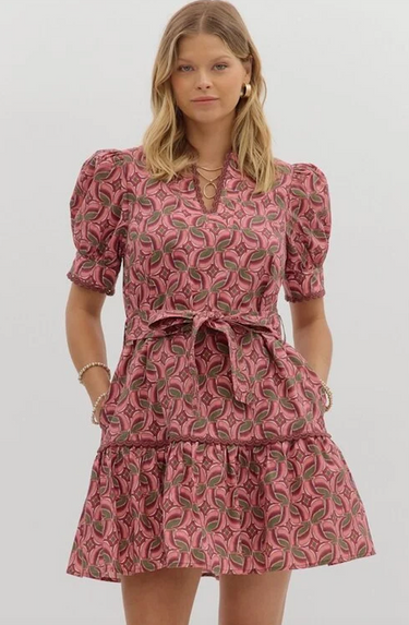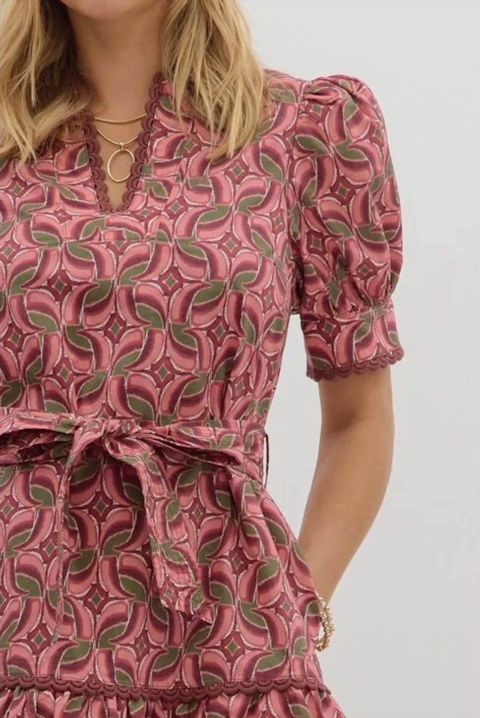 The Lila Puff Sleeve Dress is a chic statement piece with playful details. Featuring a bold pink and green geometric print, this mini dress is designed with puff sleeves, a tiered skirt, and a removable waist tie to create a flattering silhouette. The scalloped trim adds a delicate finish, while side pockets make it as functional as it is stylish. Perfect for brunch, parties, or daytime outings.