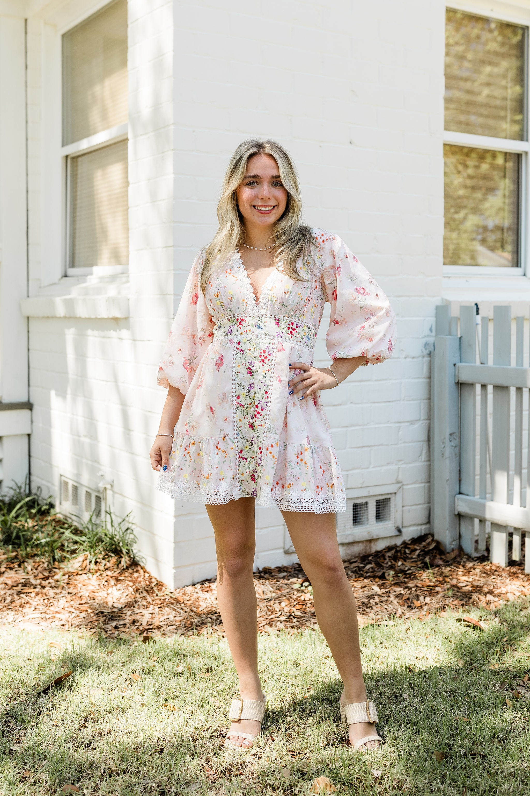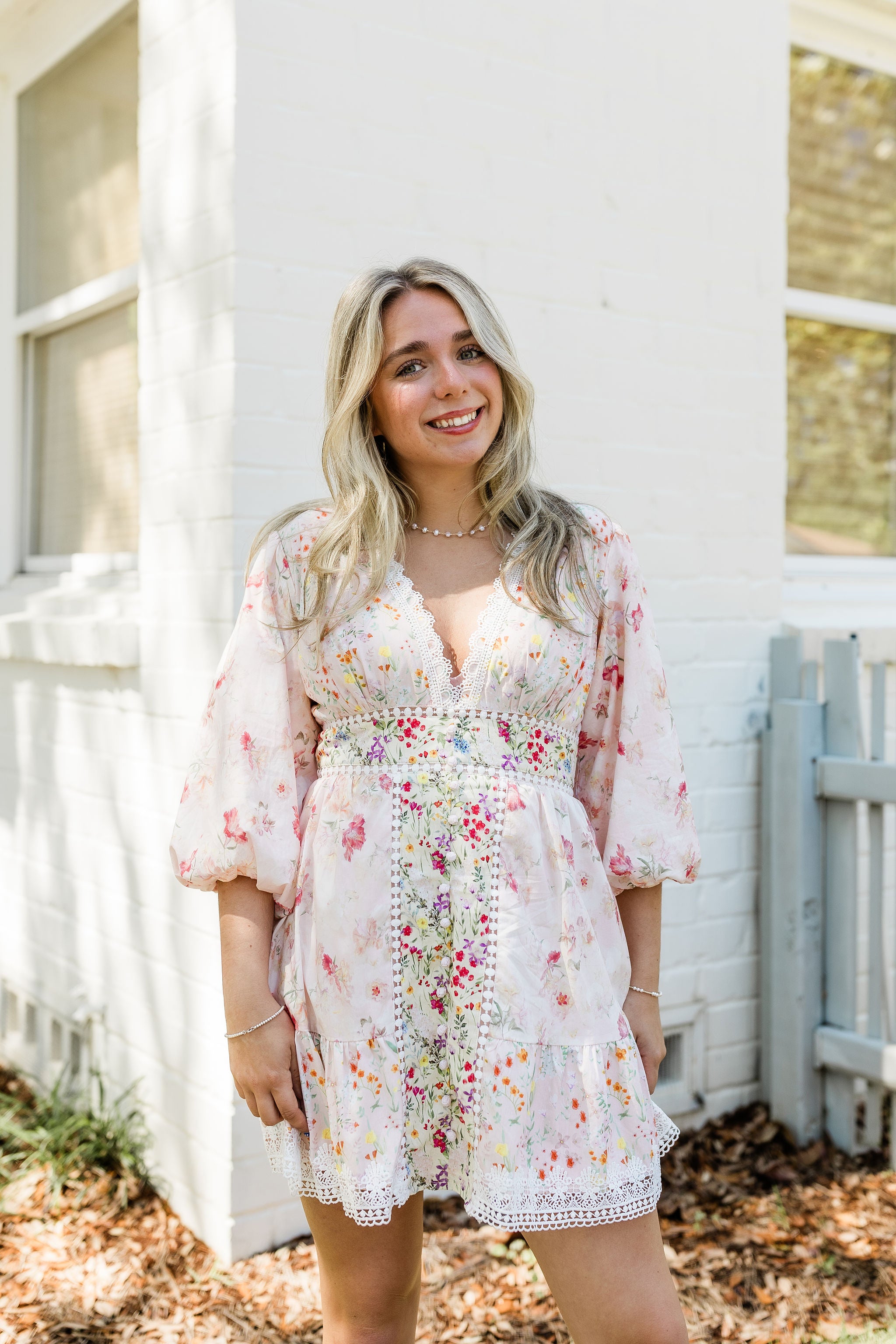 Romantic and effortlessly feminine, the Maribelle Dress is your go-to for garden parties, brunches, and sunny strolls. With soft floral patchwork and delicate lace trim, this flattering mini dress blends charm with a flirty silhouette.