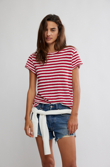 Effortlessly cool and perfectly relaxed, the Nora Striped Tee is your new everyday essential. Featuring classic red and ivory stripes with a lived-in, slightly distressed finish, this easy tee delivers that laid-back coastal vibe your closet loves. The relaxed fit, soft lightweight feel, and subtle raw edge details make it perfect for front-tucking into denim or pairing with your favorite cutoffs.