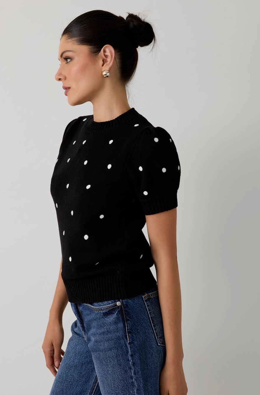 A timeless classic with a feminine twist, the Primrose Polka Dot Sweater features a soft black knit accented with crisp white polka dots. Designed with a ribbed crew neckline, subtle puff sleeves, and a polished, slightly fitted silhouette, this short-sleeve sweater is perfect for dressing up denim or layering under blazers. An easy everyday piece that feels chic, playful, and endlessly wearable.