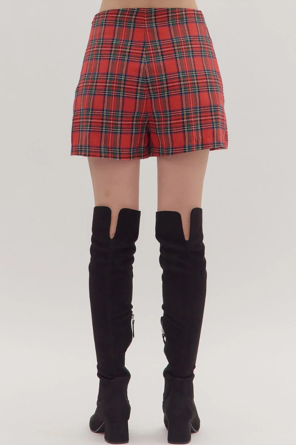 Festive and flirty, this red plaid skort gives the look of a mini with the comfort of built-in shorts—perfect for holiday parties or cozy winter days.