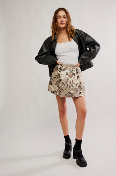 Elevated with a vintage-inspired feel, this champagne mini skirt brings effortless polish to any look. Designed with a high-rise fit and subtle A-line silhouette, it features a luxe floral jacquard fabric that adds texture and dimension. Easy to dress up or down, this skirt pairs perfectly with simple tanks, chunky knits, or a statement jacket.