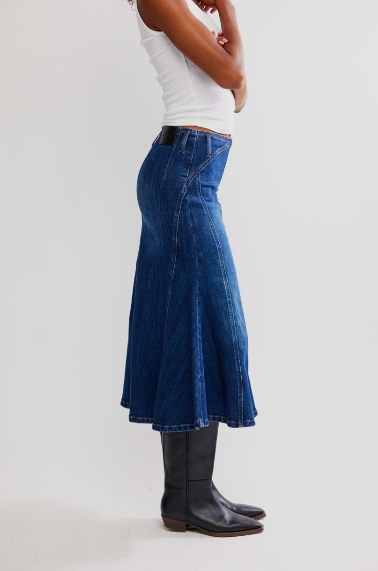 Effortlessly cool and flattering, the Zia Denim Maxi Skirt features a mid-rise fit, contoured seams, and a subtle flare at the hem. Finished in a deep indigo wash for that perfectly lived-in feel.
