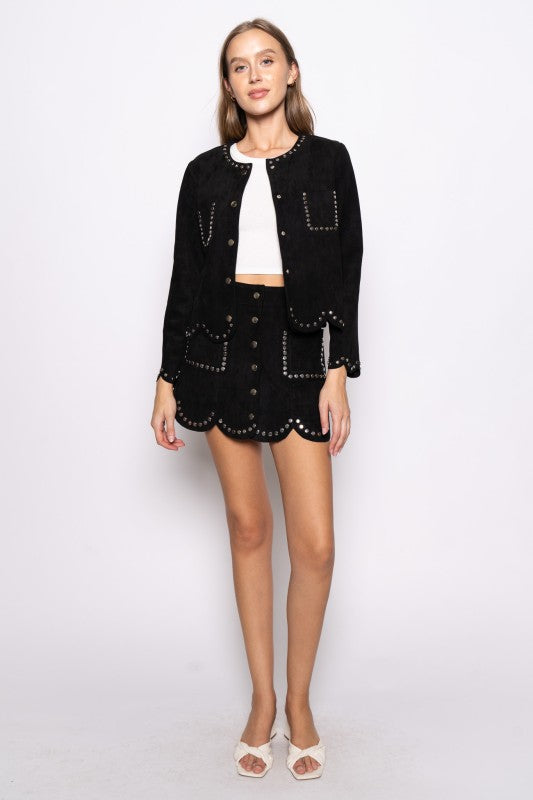 The Rowan Studded Suede Skirt is where edgy meets feminine. Made from soft black faux suede, this mini skirt features a scalloped hemline accented with silver studs and front patch pockets for a touch of retro charm. With its button-front design, it’s a versatile piece that pairs effortlessly with the matching Rowan Studded Jacket or your favorite knit top.