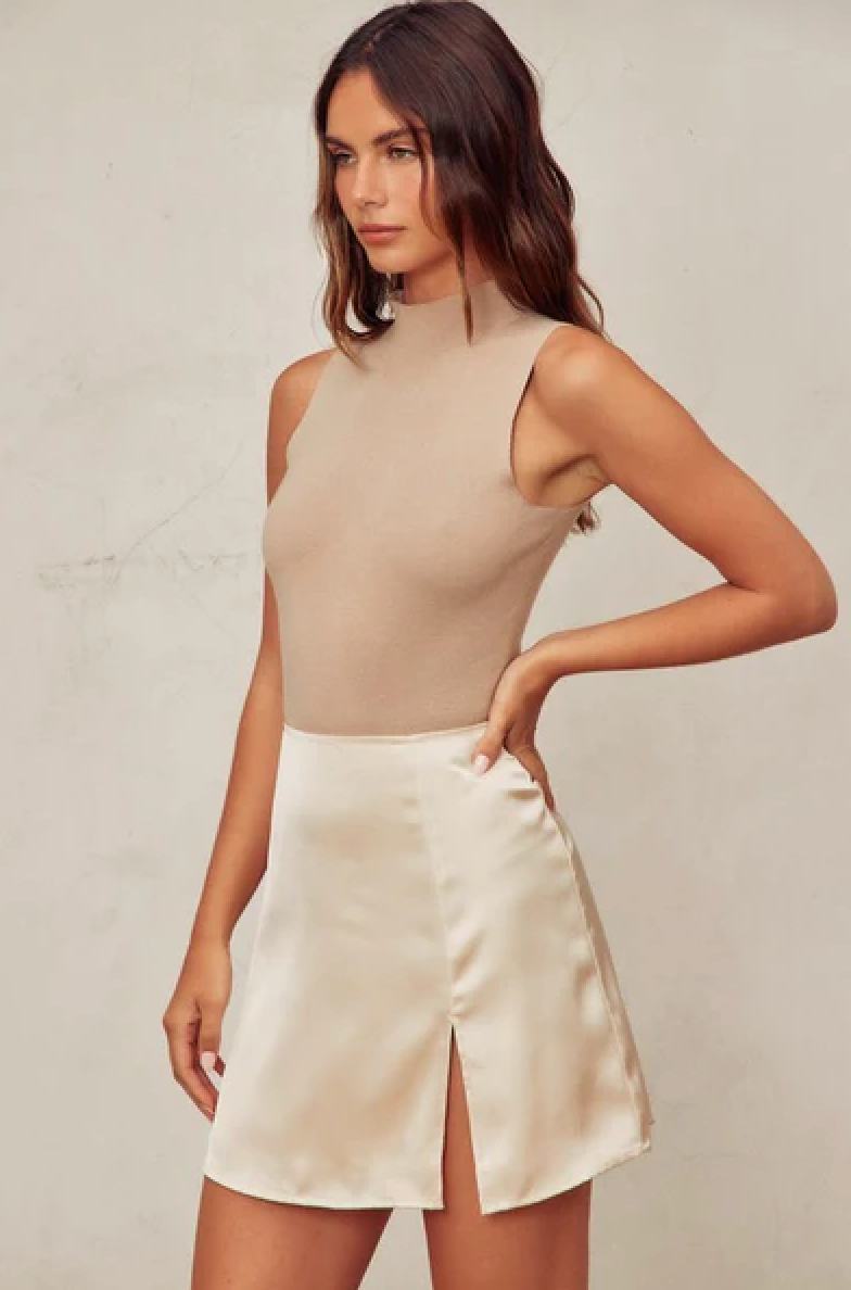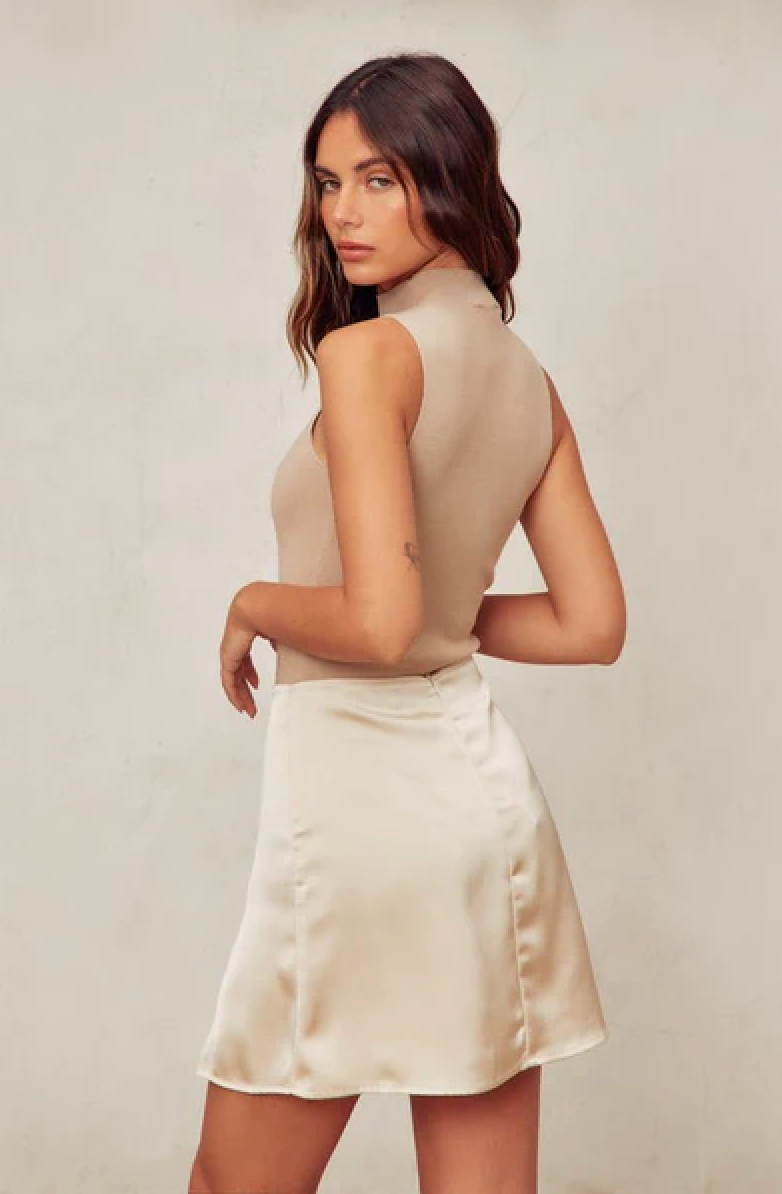 SLOANE SATIN SLIT MINI SKIRT IN CHAMPAGNE