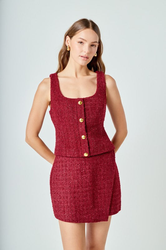 ENDLESS ROSE VIVIENNE TWEED BUTTON TANK IN MERLOT