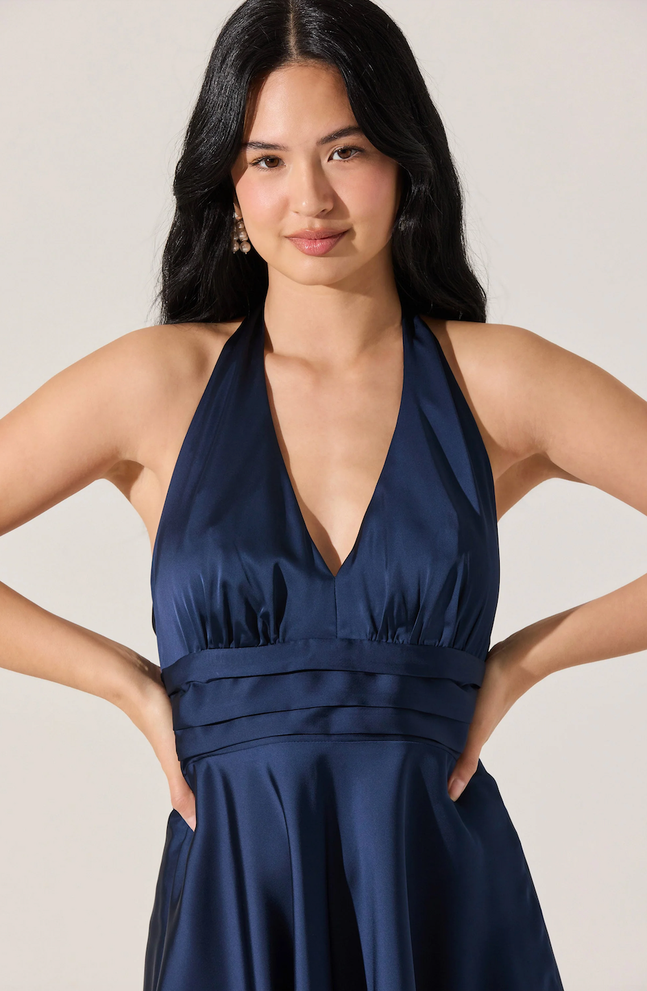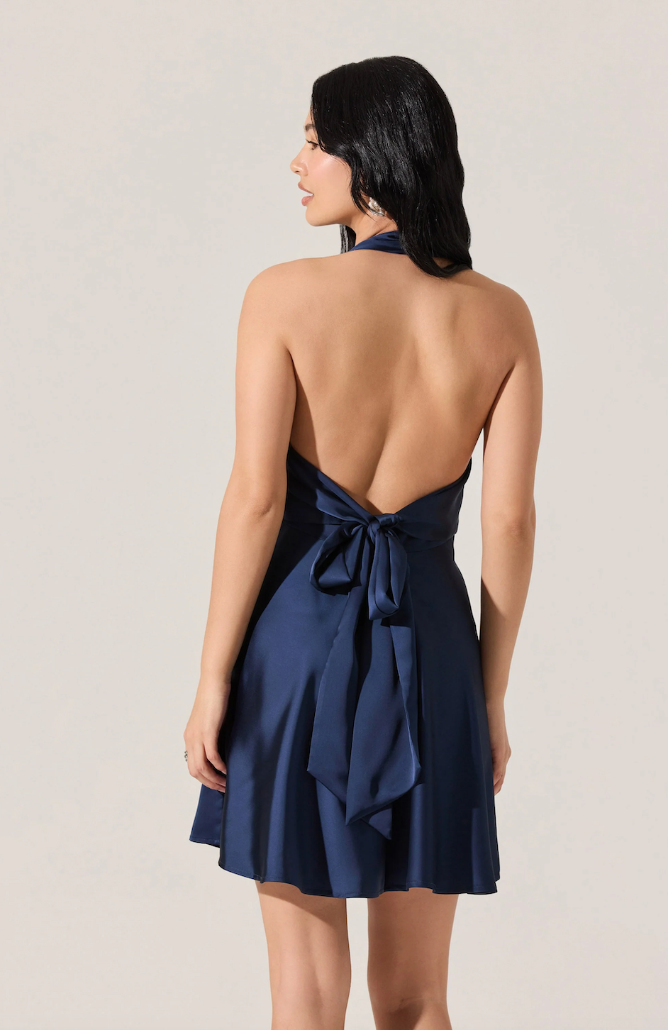 The Mielle Satin Mini Dress is sleek, flirty, and effortlessly elegant. Designed in a deep navy satin, it features a halter neckline with a plunging front and an open back that ties into a statement bow. The fitted waist flows into a flared skirt for a flattering, feminine silhouette—perfect for cocktail parties, weddings, or date nights.