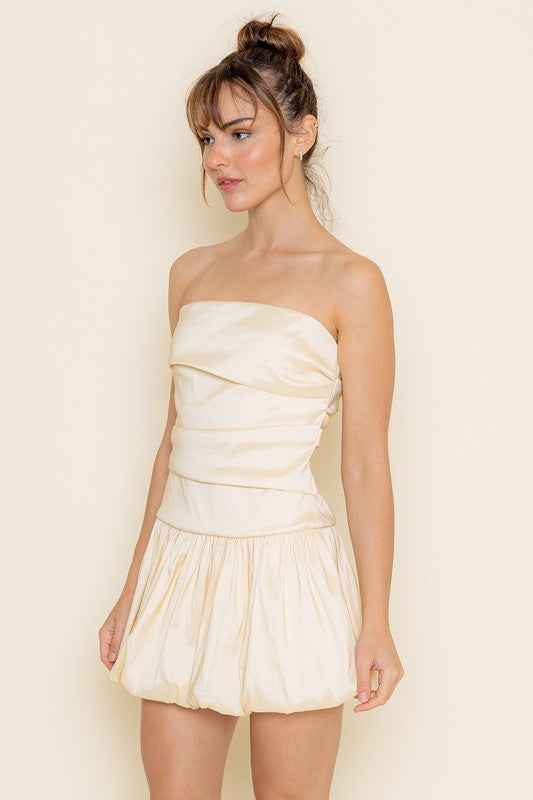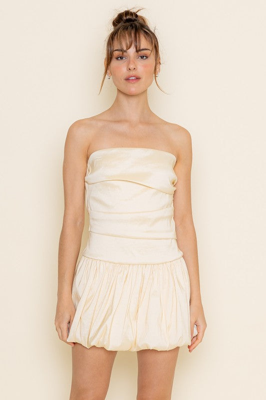 Make a statement with the effortlessly elegant Pleat and Bubble Hem Dress in Cream. Crafted from a lustrous satin-like fabric, this stunning strapless mini dress combines modern design with playful sophistication. The pleated bodice features artful draping that enhances the silhouette while offering a flattering, fitted look. A structured waistband cinches at the waist, highlighting the figure beautifully.