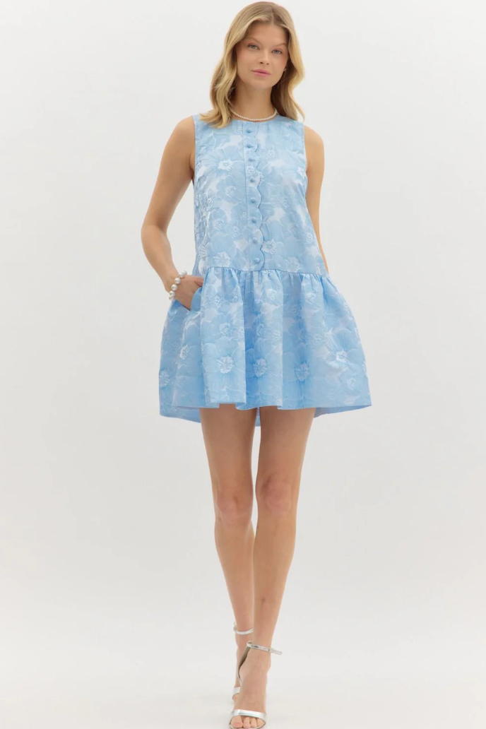 Step into sweet sophistication with this sleeveless mini dress in a delicate baby blue floral jacquard. Whether you're headed to brunch, a garden party, or a spring date, this piece brings elegance and charm with every step.