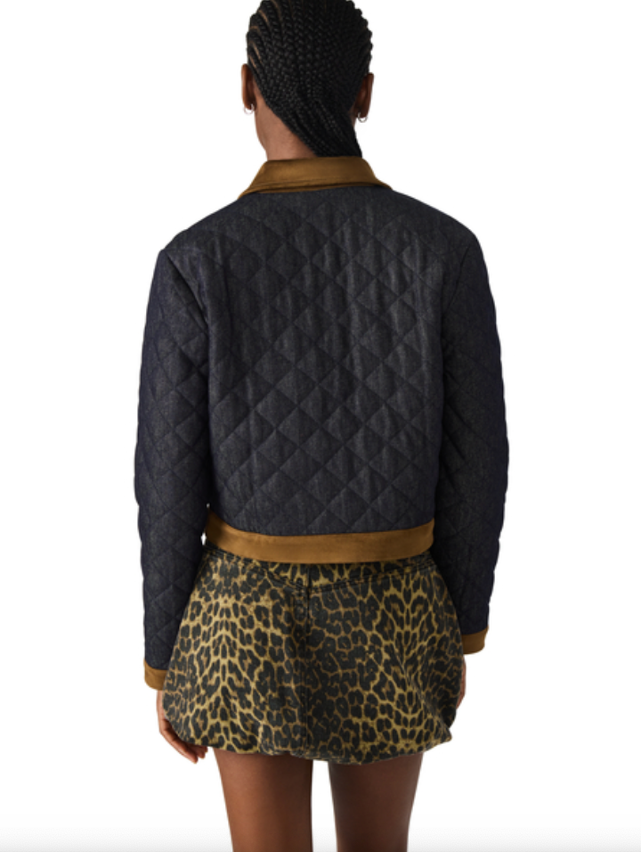 The Agatha Jacket is a bold, modern twist on outerwear with a luxe, retro-inspired vibe. Crafted in a quilted deep blue fabric, it features rich camel trim along the collar, cuffs, hem, and pockets for a striking contrast. The front zip closure and cropped silhouette make it an effortlessly cool layering piece.