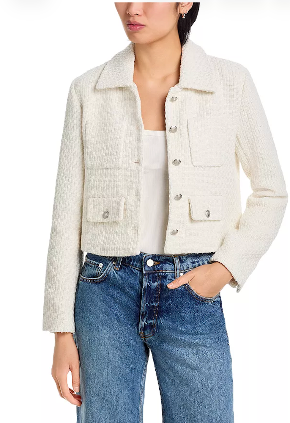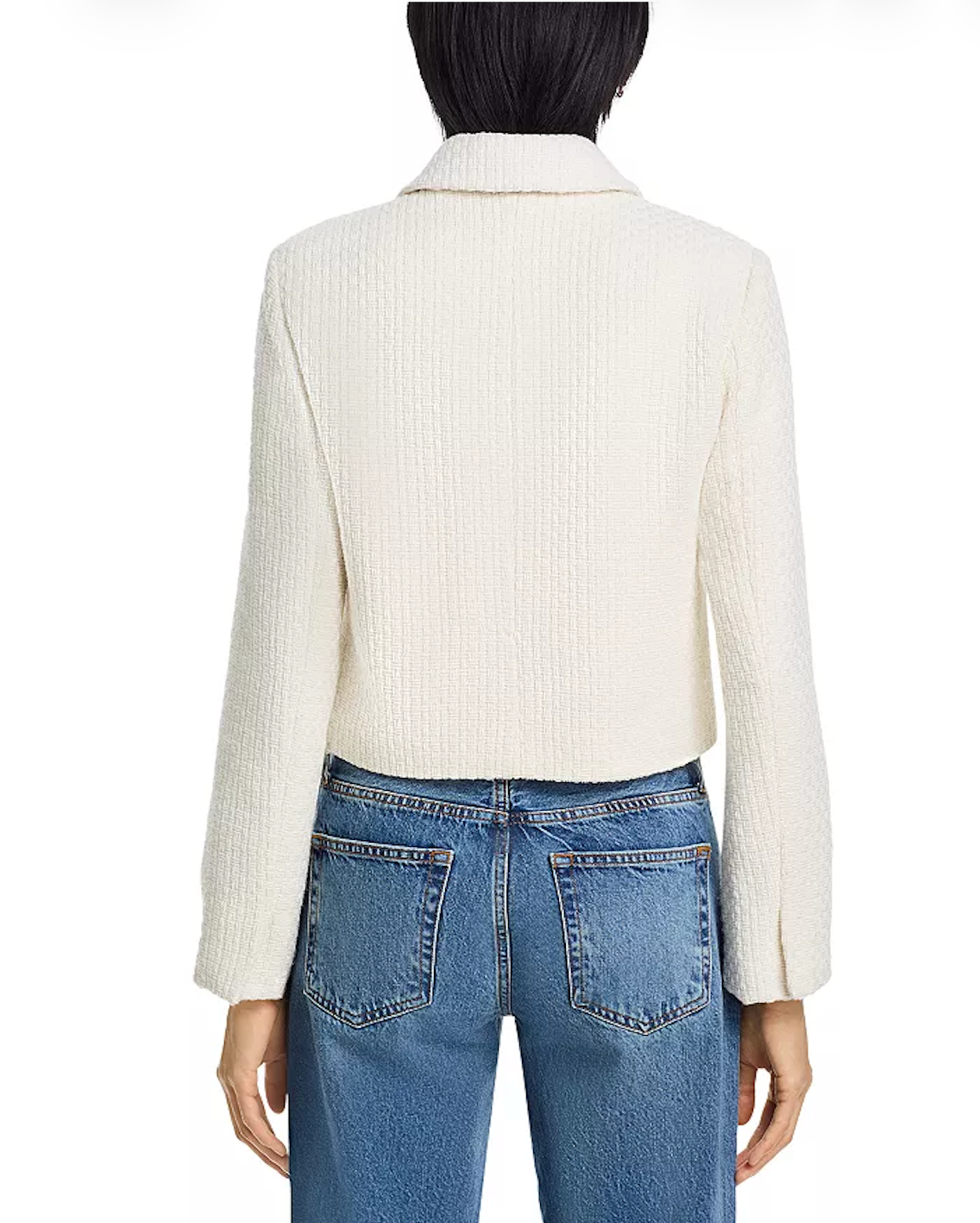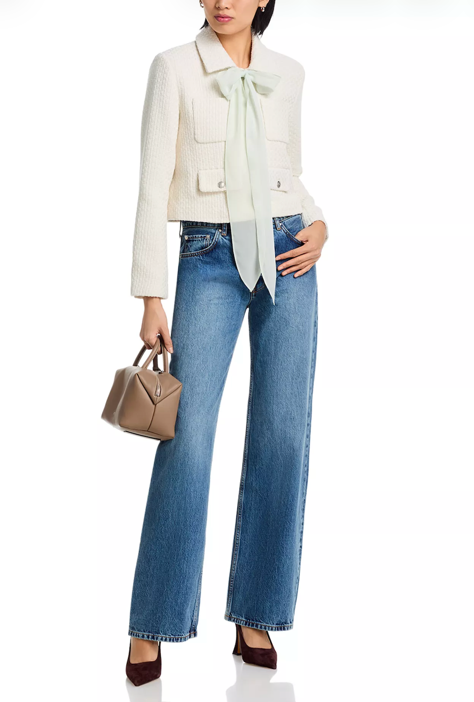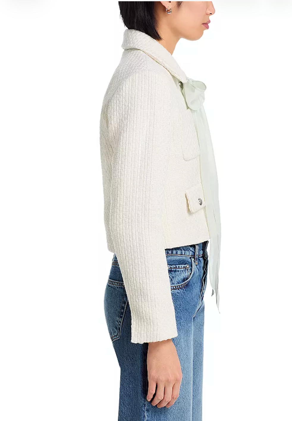 Polished with a feminine twist, this ivory tweed jacket is the definition of effortless chic. Designed with a cropped silhouette, structured collar, and classic pocket detailing, it features a soft, removable bow tie at the neckline for a touch of romance. Finished with silver-toned buttons and a textured tweed fabric, it’s the perfect balance of tailored and playful—easy to dress up or down.