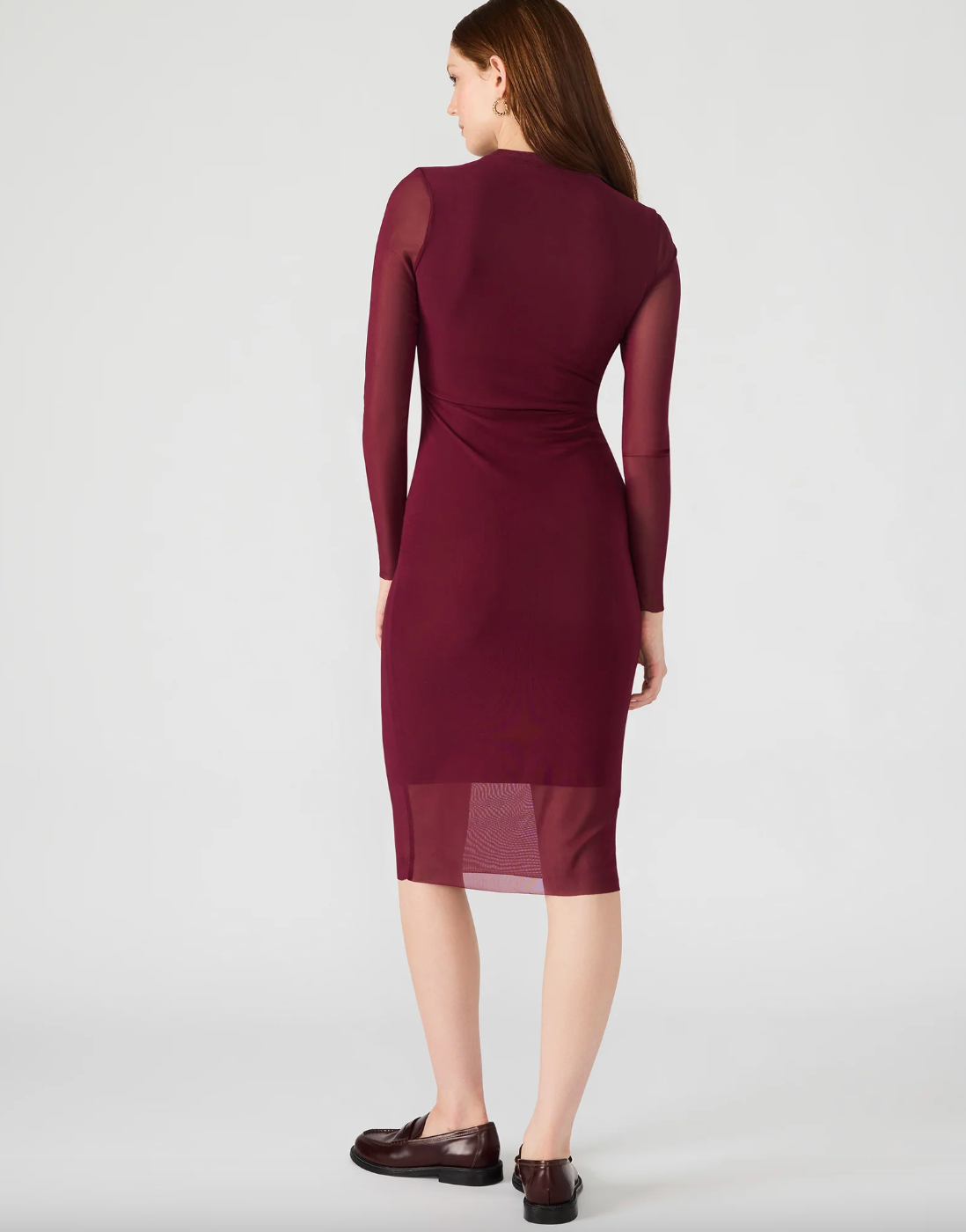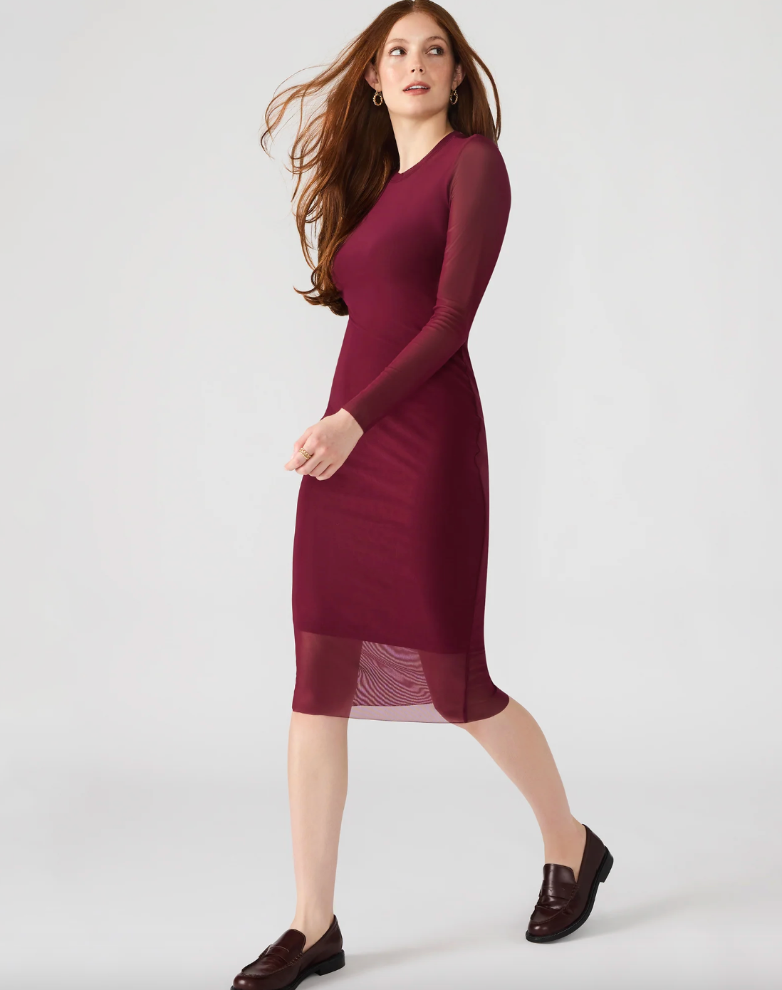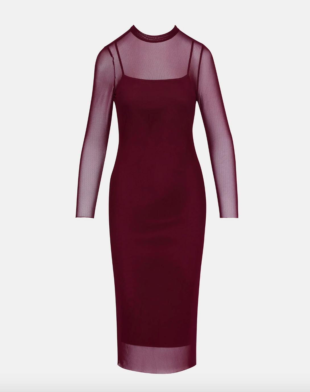 Turn heads in the sleek and sultry Hailee Dress. Crafted in a rich wine hue, this body-skimming midi features sheer mesh long sleeves and hem for a modern, sophisticated edge. The built-in slip keeps it wearable while still delivering that bold, statement look—perfect for date nights, cocktails, or special occasions.